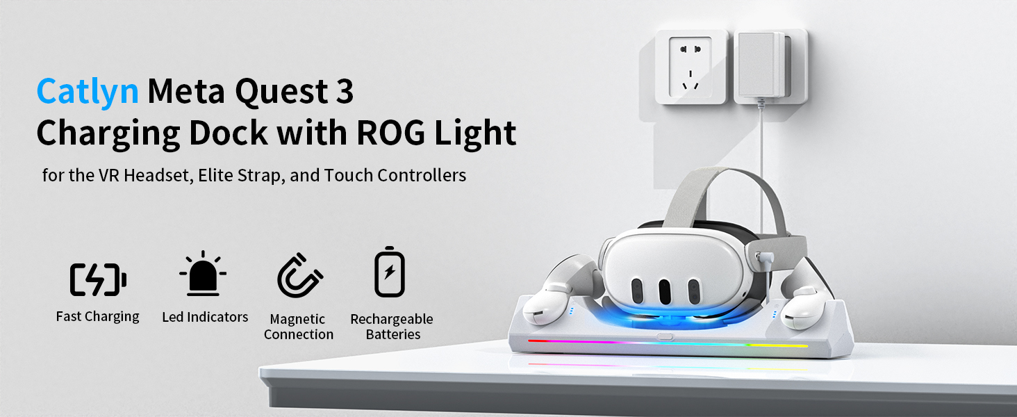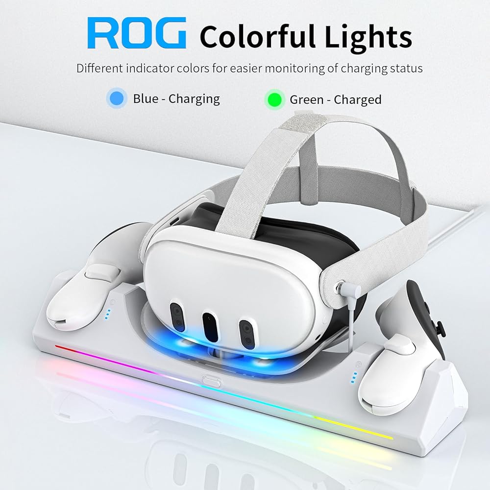 【أضواء ROG متعددة الألوان】قاعدة الشحن Oculus Quest 3 هي أروع ملحقات Quest 3 وأكثرها أناقة، مع زر منفصل لتشغيل وإيقاف أضواء ROG بسهولة. يكون مؤشر LED باللون الأزرق عند الشحن ويتغير الرمز من الأحمر إلى الأخضر عند الشحن بالكامل.