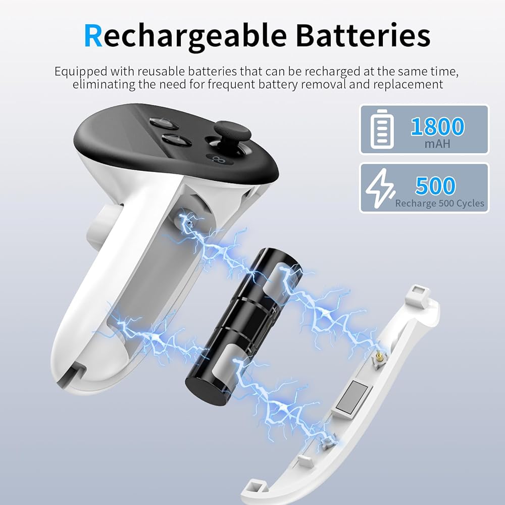 【بطاريات قابلة لإعادة الشحن】البطاريات القابلة لإعادة الشحن 2 × 1800 مللي أمبير في الساعة والأغطية المخصصة لوحدة التحكم Oculus Quest 3 توفر لك استبدال البطارية الذي لا نهاية له. البطاريات القابلة لإعادة الاستخدام لا توفر المال فحسب، بل إنها أيضًا أكثر أمانًا وصديقة للبيئة.