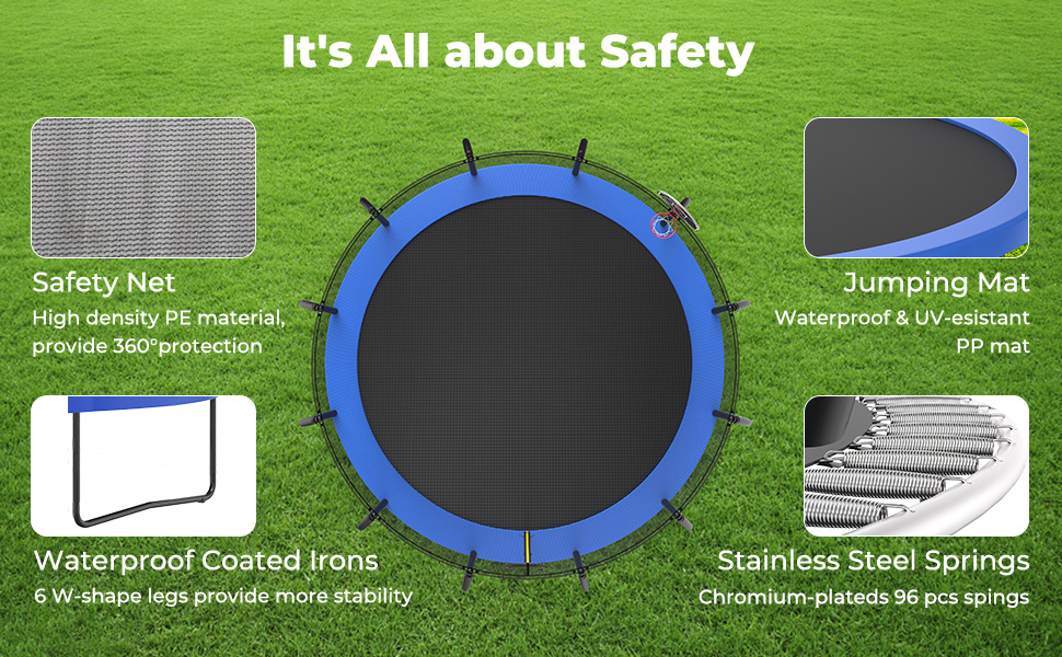 【Once For All Installation】This outdoor trampoline is made of galvanized frame inside and outside, legs are powder coated for extra protection against rust. No more need to disassemble the trampoline and bring it home even in the rain and snow day