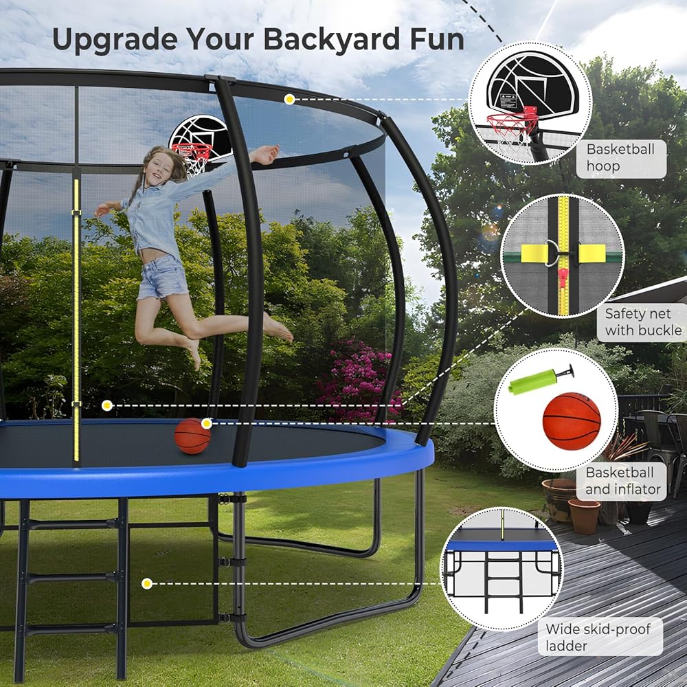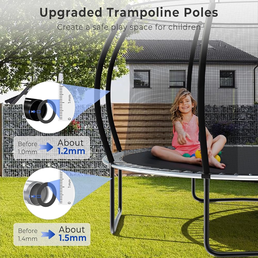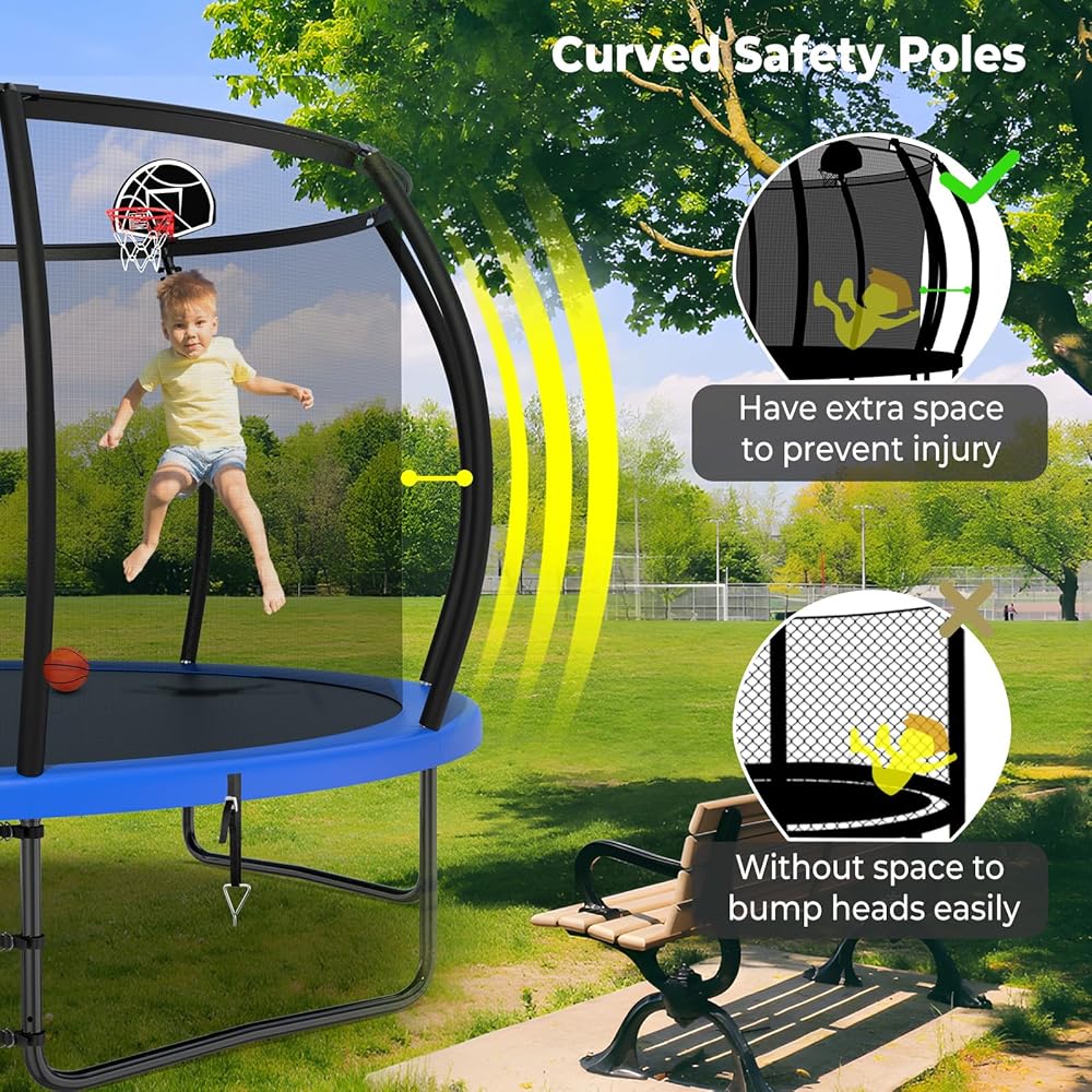 【Enhanced Safety Features】 Prioritize the safety of your loved ones with our advanced trampolines, featuring innovative curved poles designed to prevent accidents and injuries. Outdoor trampolines meet rigorous safety standards, including ASTM F381-16, ASTM F2225-15, and ASTM F963-17, ensuring top-tier protection and quality. Trust in our commitment to provide a secure environment for boundless enjoyment