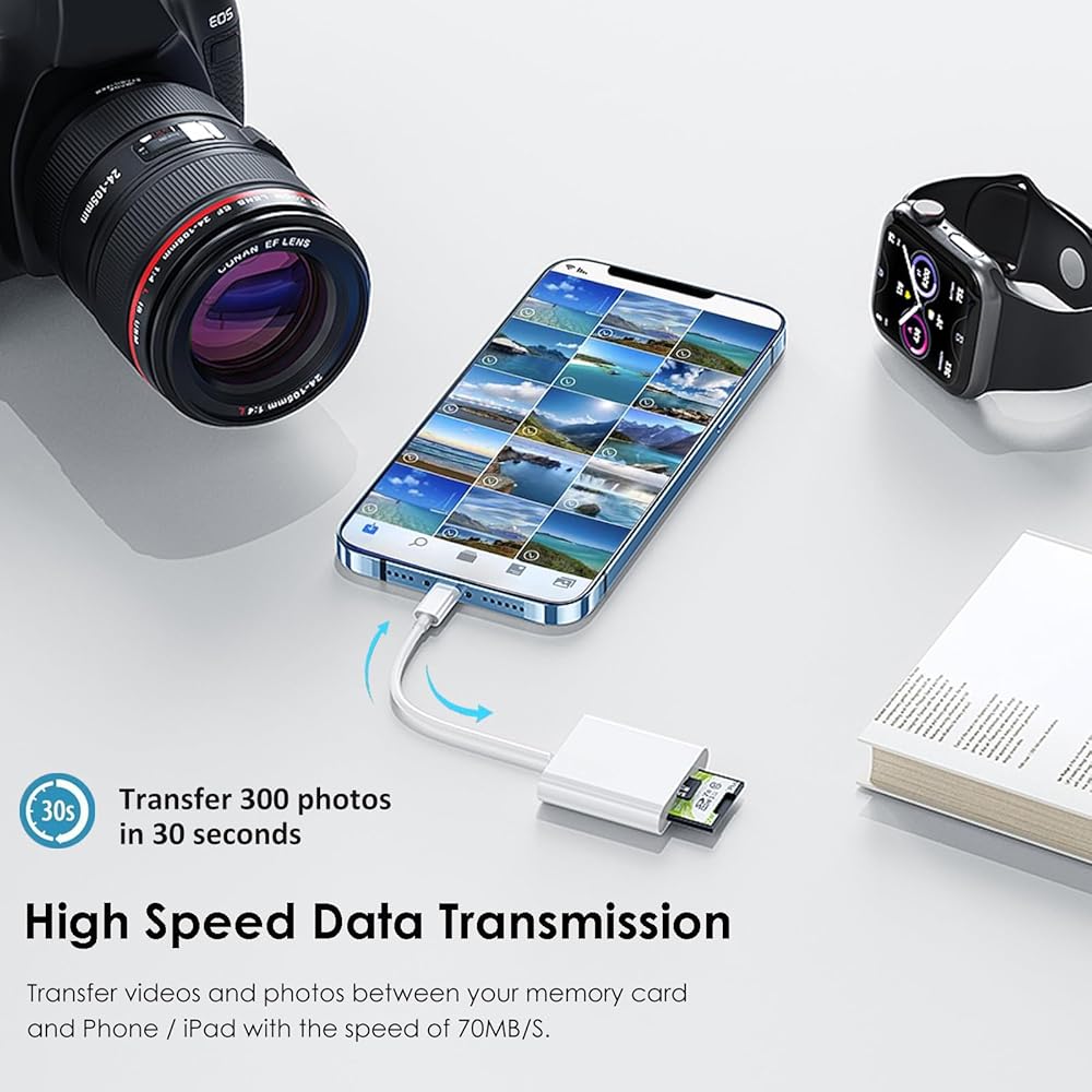 نقل عالي السرعة وفي اتجاهين: استمتع بنقل سريع للبيانات بسرعات تتراوح من 20 ميجابايت/ثانية إلى 30 ميجابايت/ثانية باستخدام قارئ بطاقة SD الخاص بنا لجهاز iPhone، مما يوفر الوقت الثمين. يدعم النقل في اتجاهين، مما يسهل الحركة السلسة للبيانات بين بطاقات SD وأجهزة iPhone.