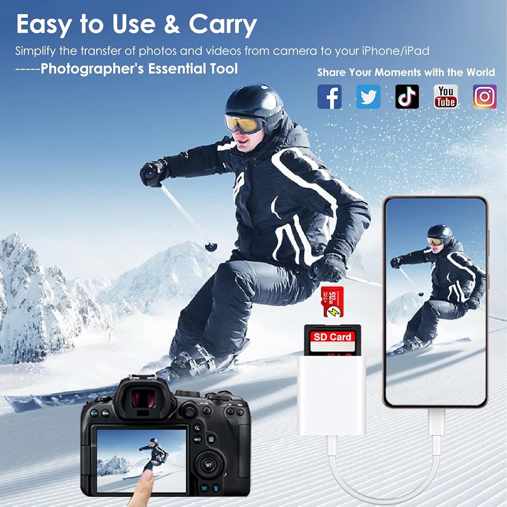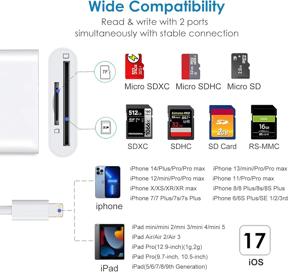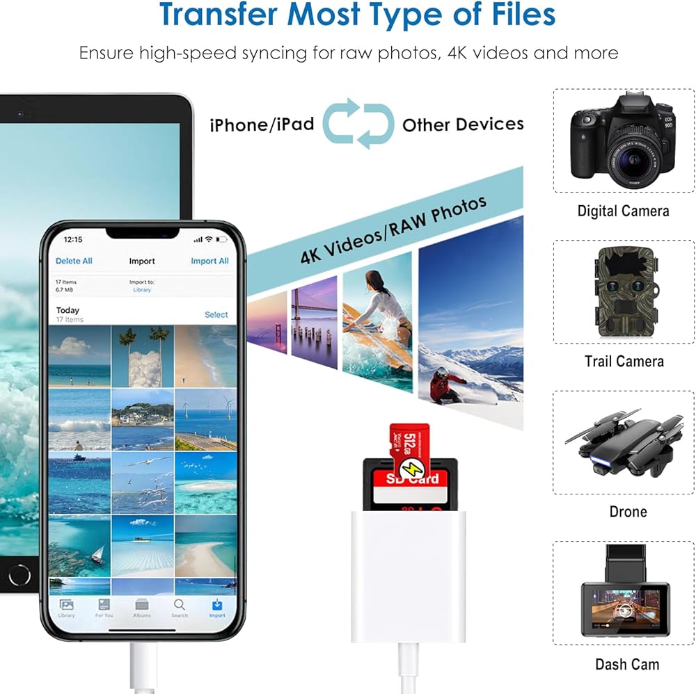 فتحة بطاقة مزدوجة 2 في 1: يدعم قارئ بطاقة SD لجهاز iPhone iPad كلاً من بطاقات الذاكرة SD وmicro SD. قم بتنزيل الصور أو مقاطع الفيديو مباشرة من بطاقات SD إلى جهاز iPhone أو iPad الخاص بك دون عناء، مما يتيح لك مشاركة اللحظات مع الأصدقاء والعائلة في أي وقت وفي أي مكان.