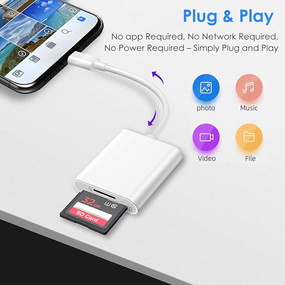 التوصيل والتشغيل: لا يوجد تطبيق مطلوب. يدعم قارئ بطاقة iPhone SD الخاص بنا بطاقات ذاكرة تصل سعتها إلى 512 جيجابايت ويتوافق مع تنسيقات الصور القياسية (JPEG وRAW) بالإضافة إلى تنسيقات الفيديو SD HD (H.264 وMPEG-4). انقل الصور ومقاطع الفيديو والملفات بسهولة مثل EXCEL وWORD وPDF.