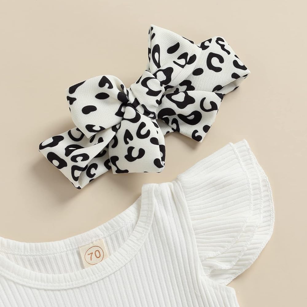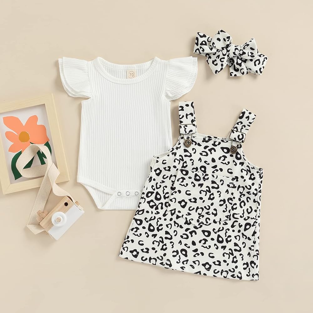 Newborn Infant Baby Girl Overall Dress Set Ruffle Knit Rib Romper Leopard Print Pocket Suspender Skirt Summer Clothing set 3 Piece ,all these details perfect for baby girls