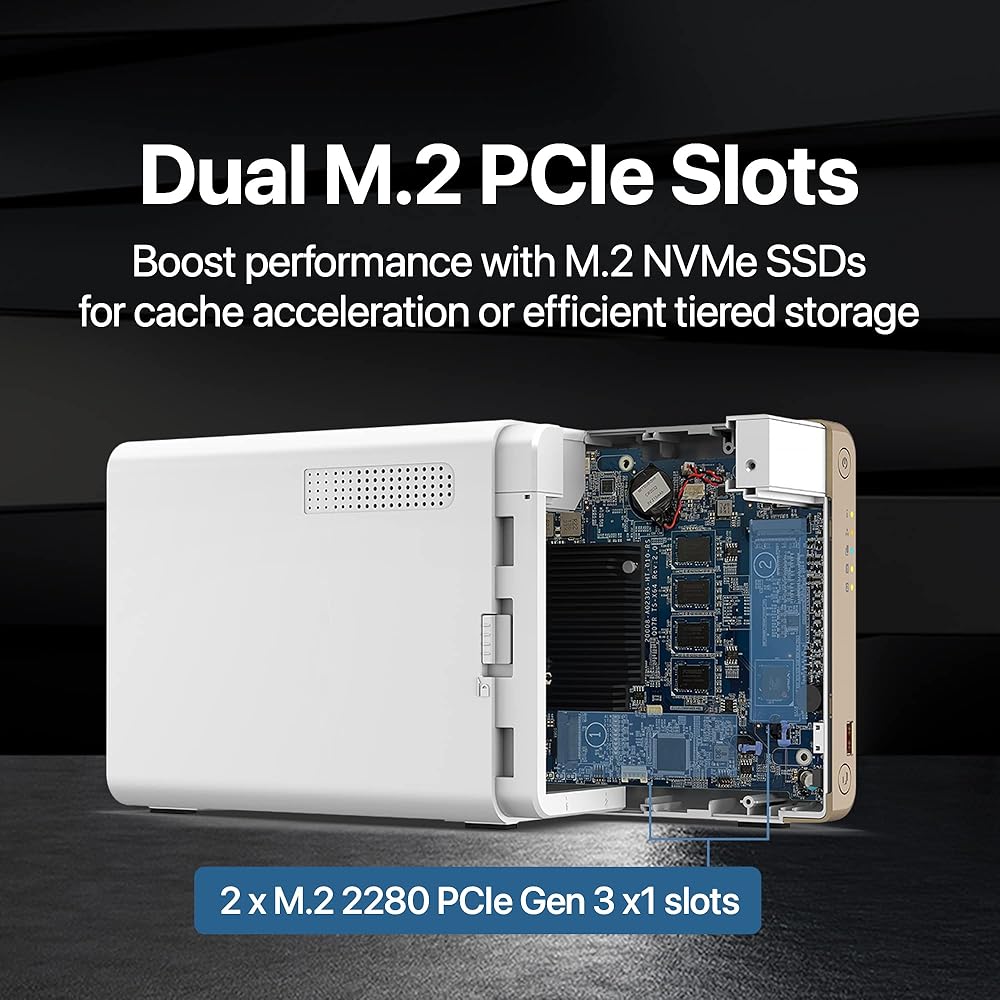 Dual M.2 PCIe Gen3x1 NVMe SSD slots enable cache acceleration or SSD storage pools for improved performance