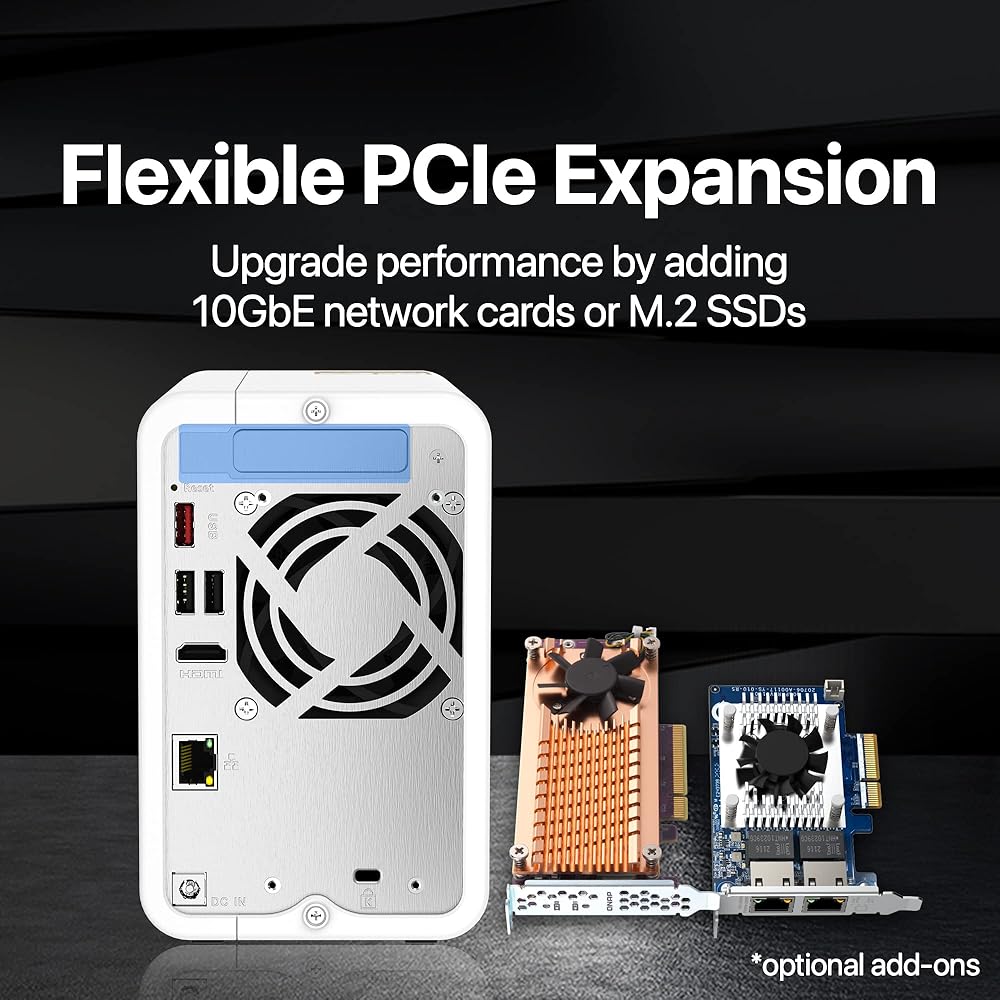 The TS-262 is powered by an Intel® Celeron® N4505 dual-core processor (burst up to 2.9 GHz), and supports SATA 6 Gb/s drives. The Intel® AES-NI encryption engine boosts encryption performance while also maintaining the security of your NAS data. You can flexibly install NVMe SSDs in the M.2 PCIe slots for cache acceleration to maximize network and storage performance for data-intensive applications or enable Qtier for auto-tiered storage for higher storage efficiency.