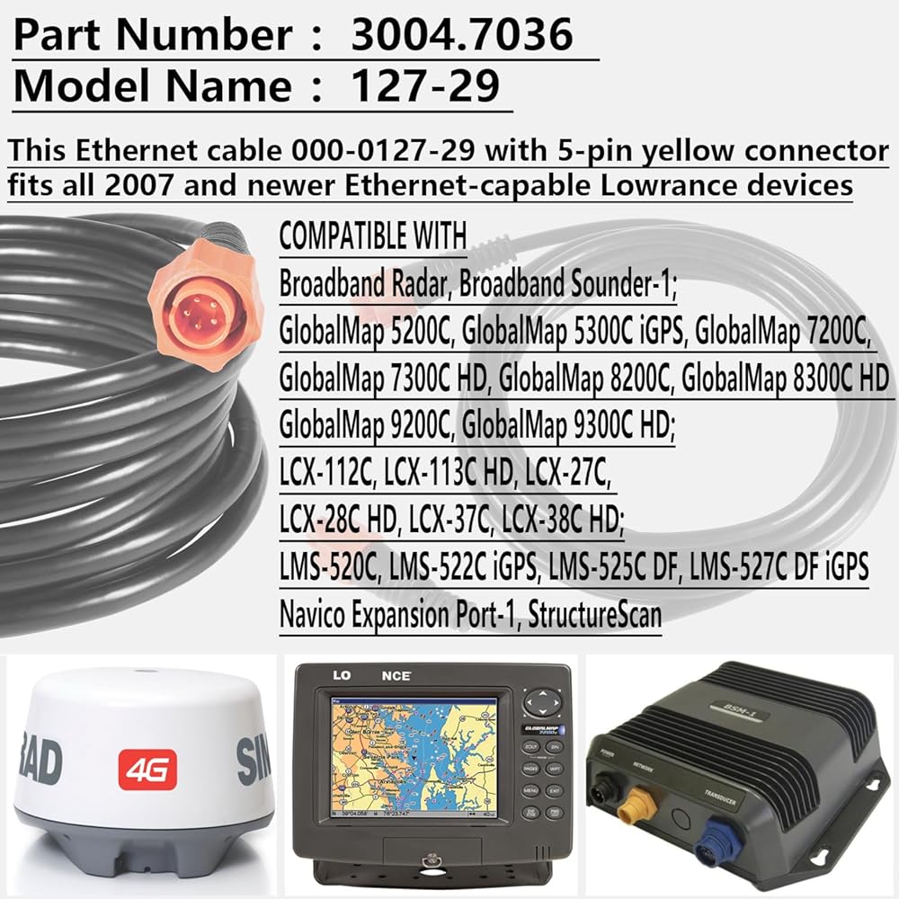 🔌【Wide Application】 Part Number :3004.7036 . Model Name :127-29 。This Ethernet cable 000-0127-29 with 5-pin yellow connector, fits all 2007 and newer Ethernet-capable Lowrance devices