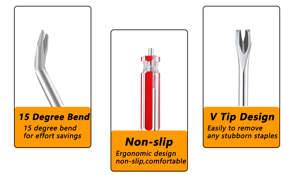 【تصميم رائع】- إن الانحناء بزاوية 15 درجة مناسب تمامًا، مما يجعل من السهل عليك الاستخدام وأقل جهدًا. تتيح لك الشوكات المزدوجة الحادة للغاية لرافعة المسامير إمكانية الانزلاق تحت تلك الدبابيس المثبتة بإحكام من أجل الإزالة السريعة.