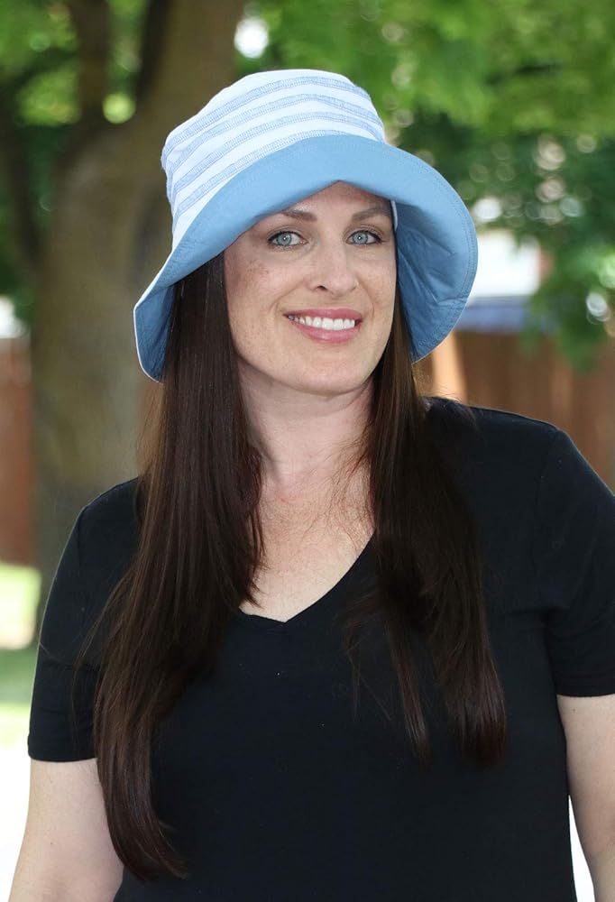 This lightweight sun hat is a perfect chemo hat for women. The three inch brim shades your eyes and neck without being overbearing. Great sun protection on your neckline.