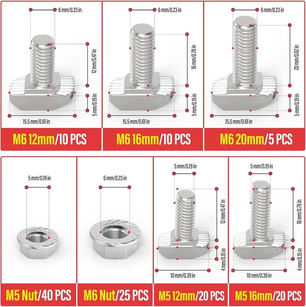 - 🛒كمية العبوة: صواميل شفة سداسية: M5 × 40 قطعة؛ M6 × 25 قطعة، برغي T: M5 × 12 مم، 20 قطعة؛ M5 × 16 مم، 20 قطعة؛ M6 × 12 مم، 10 قطع؛ M6 × 16 مللي متر ، 10 قطعة ؛ M6 × 20 مللي متر ، 5 قطعة