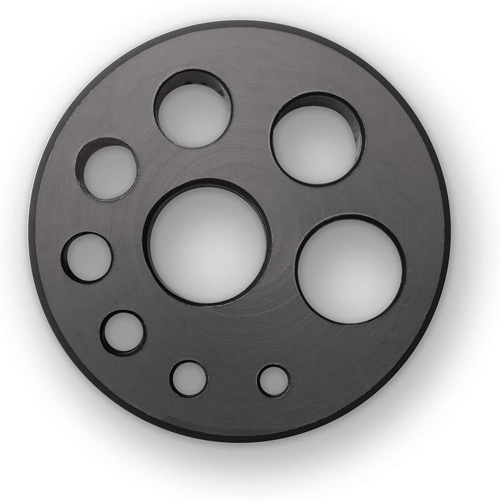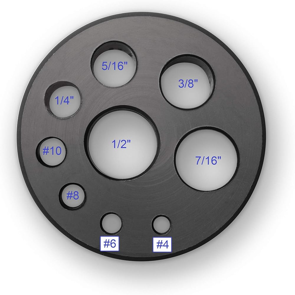Tapping by hand gets so frustrating when you feel like you have aligned everything up just right and the tap starts going in at an angle. It is nearly impossible to straighten it back up without snapping or breaking at the most valuable part. This is why Dog River Tools has created a high quality 9 hole tapping guide block for all your machining projects. This tapping block automatically keeps the tap perpendicular each and every time and helps prevents breakage and increases the tap life. Our block is a nice compact size it is 1.8 inches in diameter and almost 1” thick. The set includes 9 guided holes #4-40, #6-32, #8-32, #10-32, 1/4”-20, 5/16”-18, 3/7”-16, 7/16”-14, and ½”-13. The block is made from strong, creep resistant Black Delrin. Buy today and reduce your breakage from frequent to nearly zero on the job. This Tapping Block should be in the tool chest of every machinist, from beginner to expert.