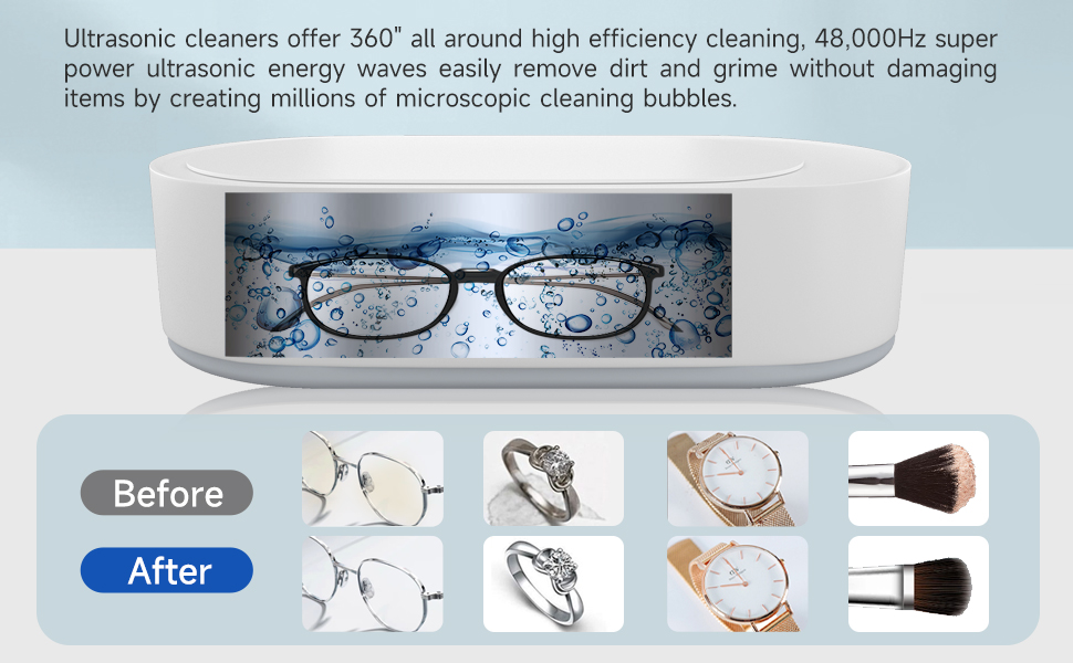 تنظيف بالموجات فوق الصوتية عالي التردد: منظف المجوهرات بالموجات فوق الصوتية قادر على انبعاث موجات فوق صوتية تصل إلى 45 كيلو هرتز، ويمكن لهذا الاهتزاز عالي التردد التخلص بسرعة من الأوساخ والشحوم والشوائب الأخرى المرتبطة بسطح الجسم لتحقيق تنظيف عميق.
