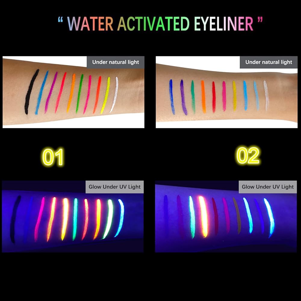 【قلم تحديد عيون منشط بالماء】- محدد عيون مائي 2 * 10 ألوان مع فرشاة.--01 لوحة تحتوي على 7 ألوان مضيئة (أخضر فلورسنت، أحمر، وردي فاقع، أخضر، برتقالي، وردي، أرجواني يمكن أن يتوهج تحت ضوء الأشعة فوق البنفسجية)؛ --02 لوحة تحتوي على لونين مضيئين (برتقالي، أخضر، يتوهج تحت ضوء الأشعة فوق البنفسجية).