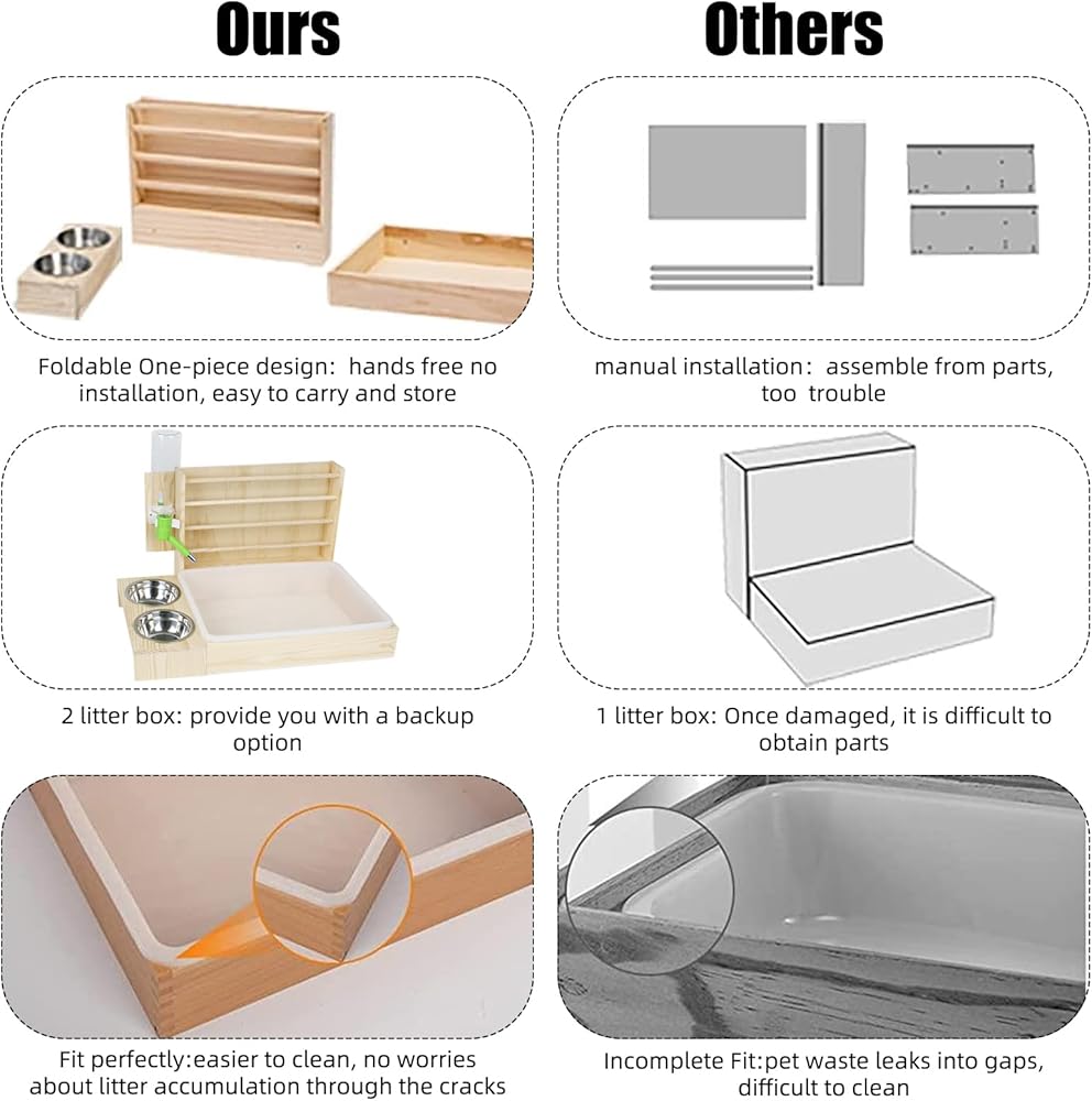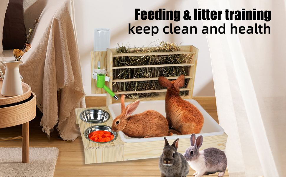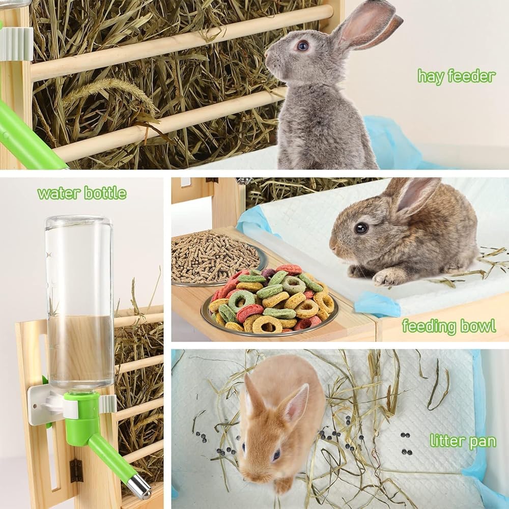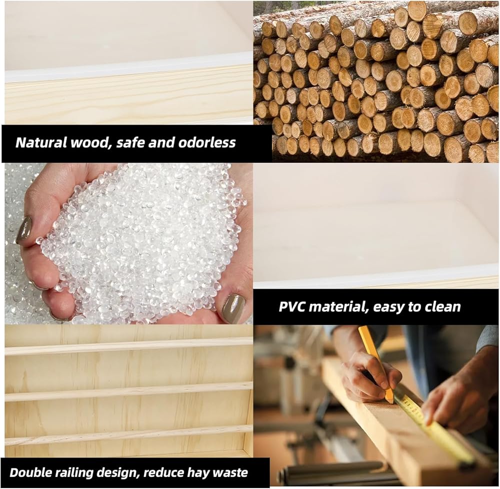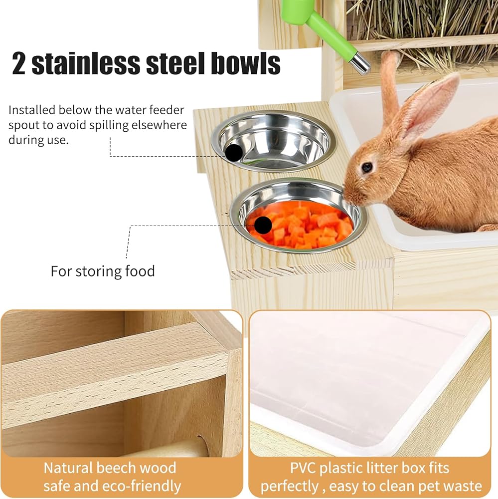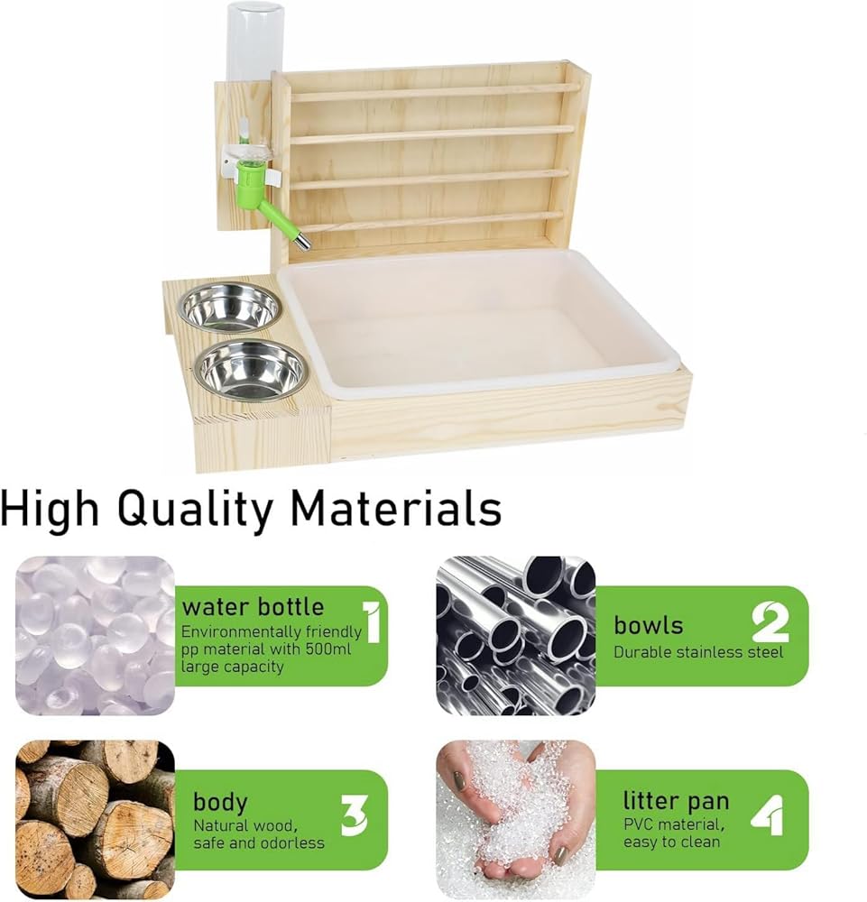 【نظيفة وصحية】 تسمح لك وحدة تغذية القش الخشبية بإضافة القش من الأعلى لمنح أرنبك إمكانية الوصول إلى الطعام النظيف. زجاجة سعة 500 مل تكفي للأرنب لشرب الماء في يوم واحد، وزجاجة المياه مصنوعة من كرة من الفولاذ المقاوم للصدأ بتصميم مقاوم للماء، وهو أكثر ملاءمة للحيوانات الأليفة الصغيرة لشرب الماء. 2 صينية بلاستيكية قابلة للفصل وقابلة للتبديل لضمان أن الحيوانات الأليفة يمكنها دائمًا استخدام صندوق الفضلات النظيف.