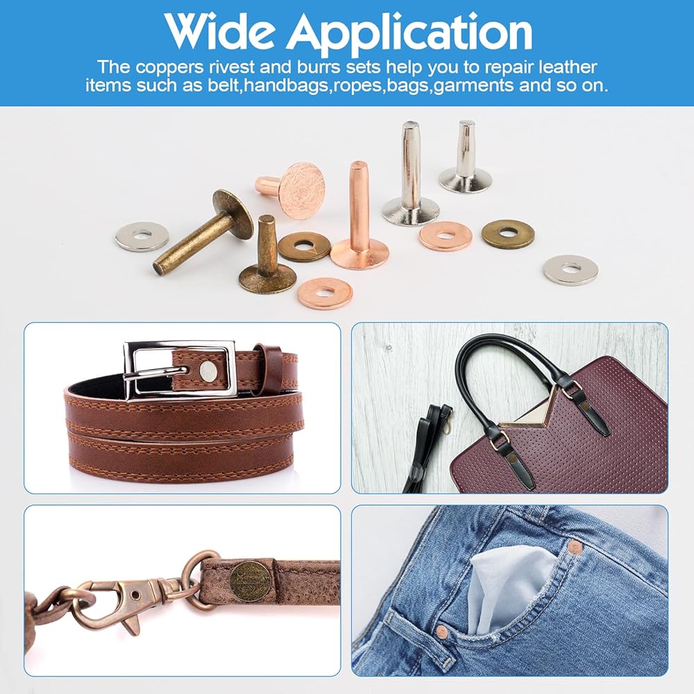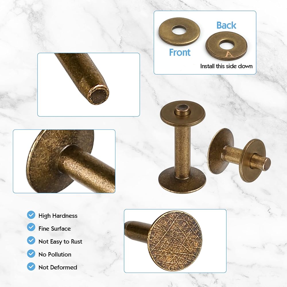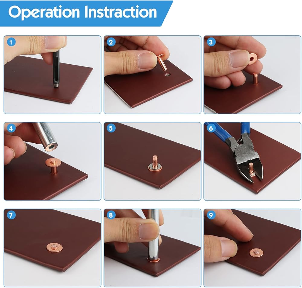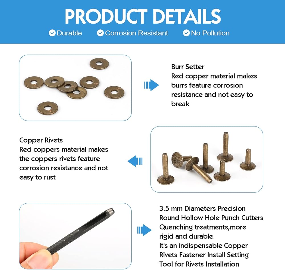 سهلة التشغيل: مجموعة المسامير النحاسية والغسالات الخاصة بنا سهلة التركيب دون أي أدوات معقدة، وتوفر وقتك وطاقتك، وفي الوقت نفسه، تساعدك على تثبيت أنواع المنتجات الجلدية، لتلبية احتياجات التثبيت المتنوعة الخاصة بك
