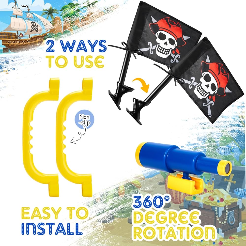 • Funny Playground Equipment: you will receive a set of swing set accessories with screws, including a pirate flag for playset, a playset steering wheel, and a playground telescope, and 2 safety handles; They are enough to build a nice play scene for playing