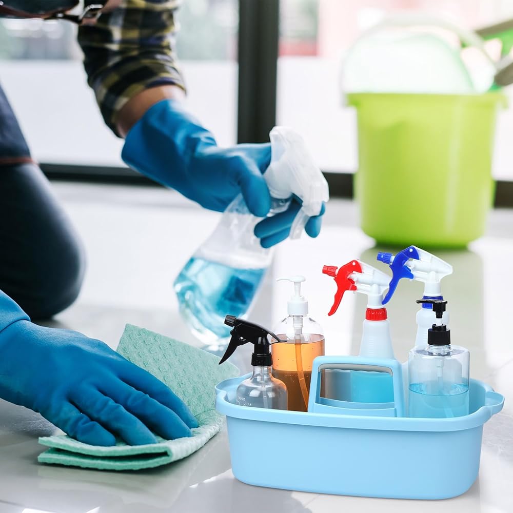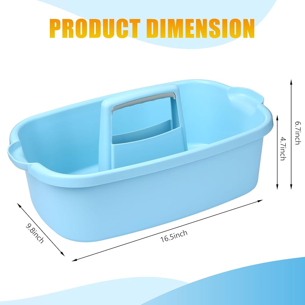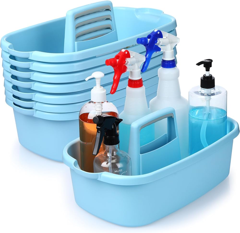 A cleaning caddy organizer with open lids fits various cleaning tools and is ideal for toting cleaning supplies such as spray cans, bottles, scrubbers, squeegees, brushes, cleaning cloths, a full roll of paper towels, and other tools you may need.