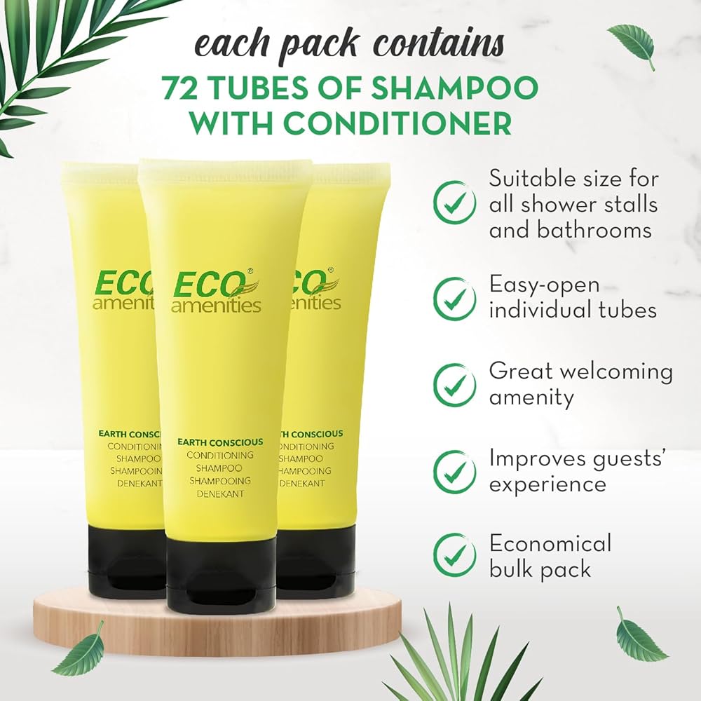 شامبو مرطب بحجم السفر من Eco Amenities - 72 عبوة، أنابيب صغيرة بوزن 1 أونصة مع أغطية قابلة للطي، رائحة الشاي الأخضر، علبة كبيرة من أدوات الزينة ذات الحجم التجريبي، عينات للعناية بالشعر معبأة بشكل فردي، زجاجات شامبو وبلسم صغيرة 2 في 1 لضيوف Airbnbs، عملات