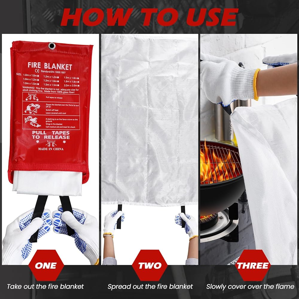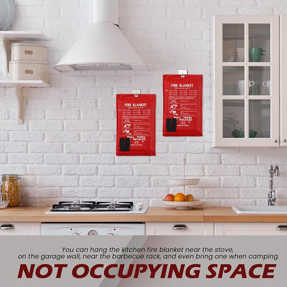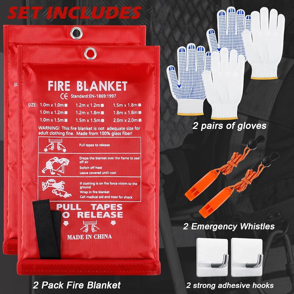 Features: Each set includes 4 fire blankets, 4 stainless steel hooks, 4 pairs of gloves, and 4 emergency whistles, specially crafted to furnish security and accessibility in moments of need. The fire blankets, made from tightly woven fiberglass posts, are sized 39.3'' x 39.3'', adequate to cover and extinguish small fires. Operation of these fire retardant blankets is simple and intuitive. Just pull them out from the package via the pull strap and drape over the fire till it's extinguished. An aspect of our fiberglass fire blankets is their reusability. After use, if they are not damaged, you can clean and fold them back for future use if needed. Specifications: Material: Fire blanket: woven fiberglass posts Hook: stainless steel Color: as pictures shown Size: Fire blanket: approx. 39.3 x 39.3 inches Hook: approx. 1.77 x 1.77 x 1.18 inches/ 4.5 x 4.5 x 3 cm Glove: approx. 8.66 x 4.72 x 0.2 inches/ 22 x 12 x 0.5 cm Emergency whistles: approx. 0.79 x 19.69 inches/ 2 x 50 cm Package includes: 4 x Fire blankets 4 x Hooks 4 Pairs gloves 4 x Emergency whistles Notes: Manual measurement, please allow slight errors on size. The color may exist a slight difference due to different screen displays.