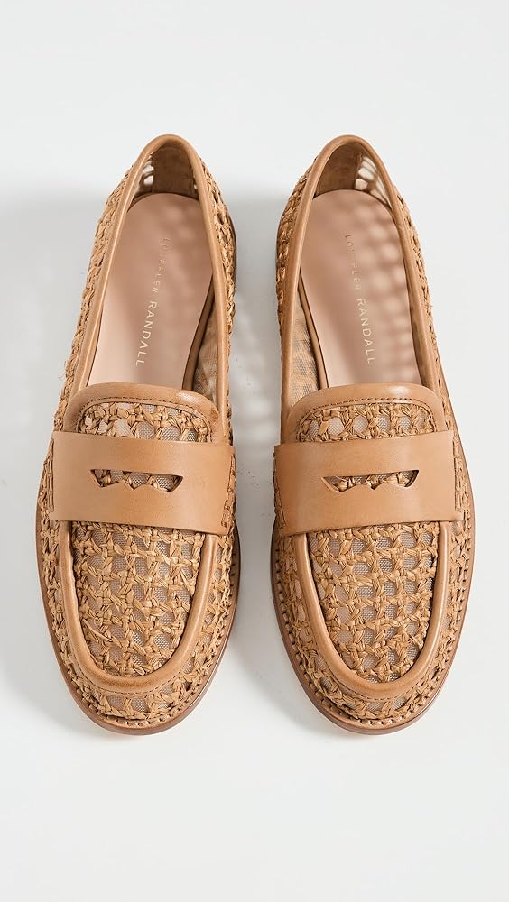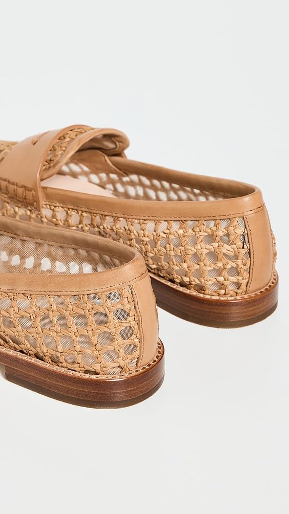 Penny loafer in natural crochet raffia. Features a padded leather footbed with gold stamped logo, a round toe, and a slip-on design. 0.75-inch heel.