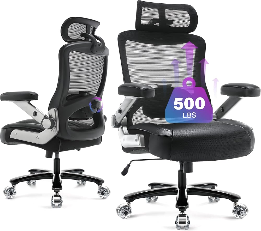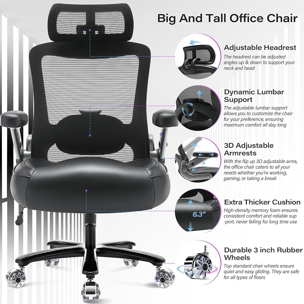 كرسي مكتب كبير وطويل بوزن 500 رطل - كرسي كمبيوتر تنفيذي عالي التحمل مع أذرع قلابة ثلاثية الأبعاد وعجلات كبيرة، كرسي مكتب خلفي عالي شبكي مريح، مقعد عريض للغاية ودعم قطني قابل للتعديل ومسند للرأس
