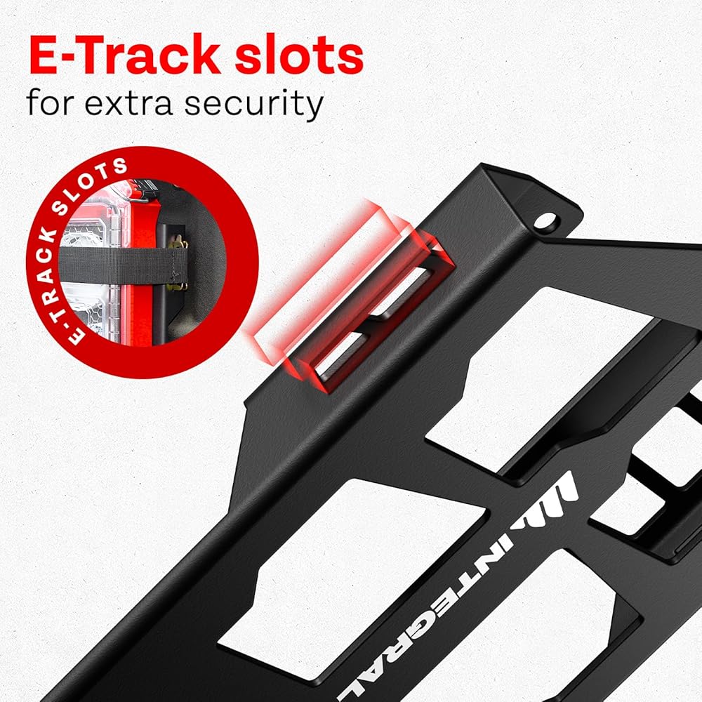UTILITY PATENT PENDING TO BE ENFORCED - 11-gauge laser cut steel. Two layers of powdercoat. Rust-resistant, coated stainless hardware. Thread-forming T30 bolts, T30 bit, and washers included. Integrated E-Track slots on each side for additional security, if necessary. Metal stamped with a custom mold to ensure precise bends and fitment.