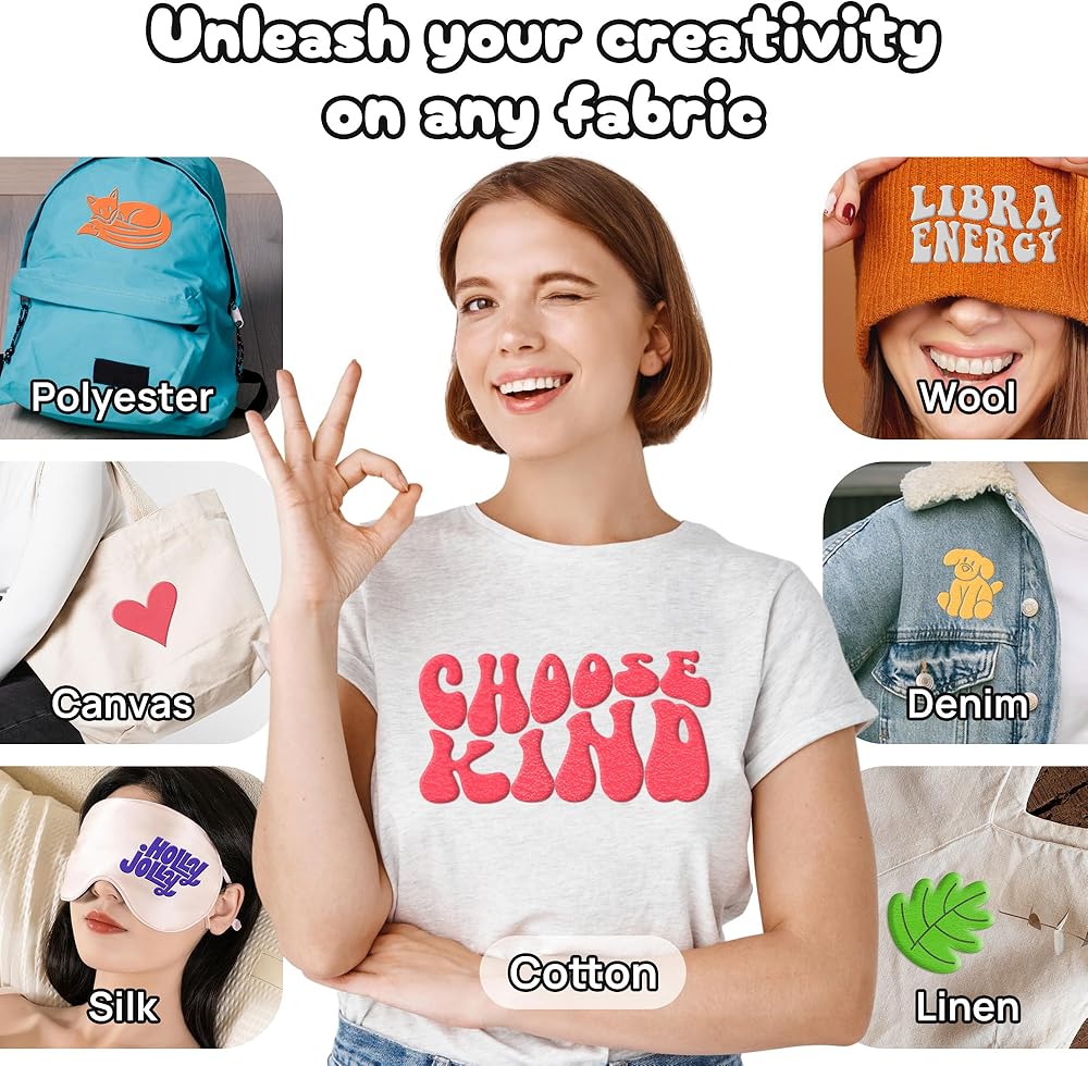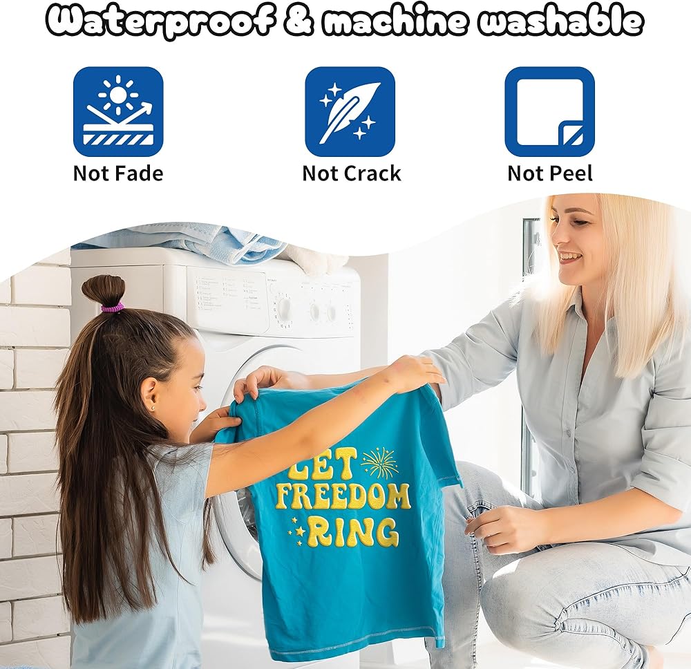 التصاق قوي وقابل للغسل: يمكن لفينيل النقل الحراري المنتفخ ثلاثي الأبعاد من LIKCUT أن يحافظ على تصميمك مع تأثير الرغوة الأولي واللون لفترة طويلة. حتى بعد الغسيل المتكرر، يمكن أن يضمن التصاق سلس بالنسيج، دون أن يبهت أو يتقشر أو يتشقق.