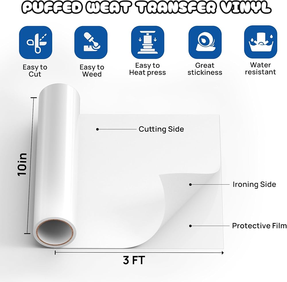 تأثير منتفخ ومتين: يتمدد الفينيل الأبيض المنتفخ ويشكل رغوة عند الضغط عليه وتسخينه، مما يخلق تأثيرًا ثلاثي الأبعاد غير لامع فريد من نوعه. على عكس فينيل htv الناعم العادي، فإن فينيل htv المنتفخ الخاص بنا يتميز بملمس سميك يضيف بعدًا وشخصية إلى مشروعاتك اليدوية!