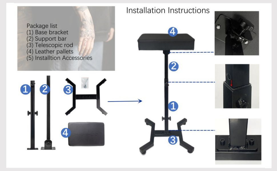 تركيب تصميم ثابت وسهل وقوي: فقط قم بتوصيل وسادة الذراع وأعمدة الدعم والقاعدة، ويستغرق حوالي 4-5 دقائق. مسند ذراع الوشم بقاعدة رباعية الزوايا، ارتفاع ثابت مزدوج، قبضة قوية على القاعدة ذات الزوايا الأربع، تصميم ثابت للغاية، تحسين كفاءة عمل الفنان