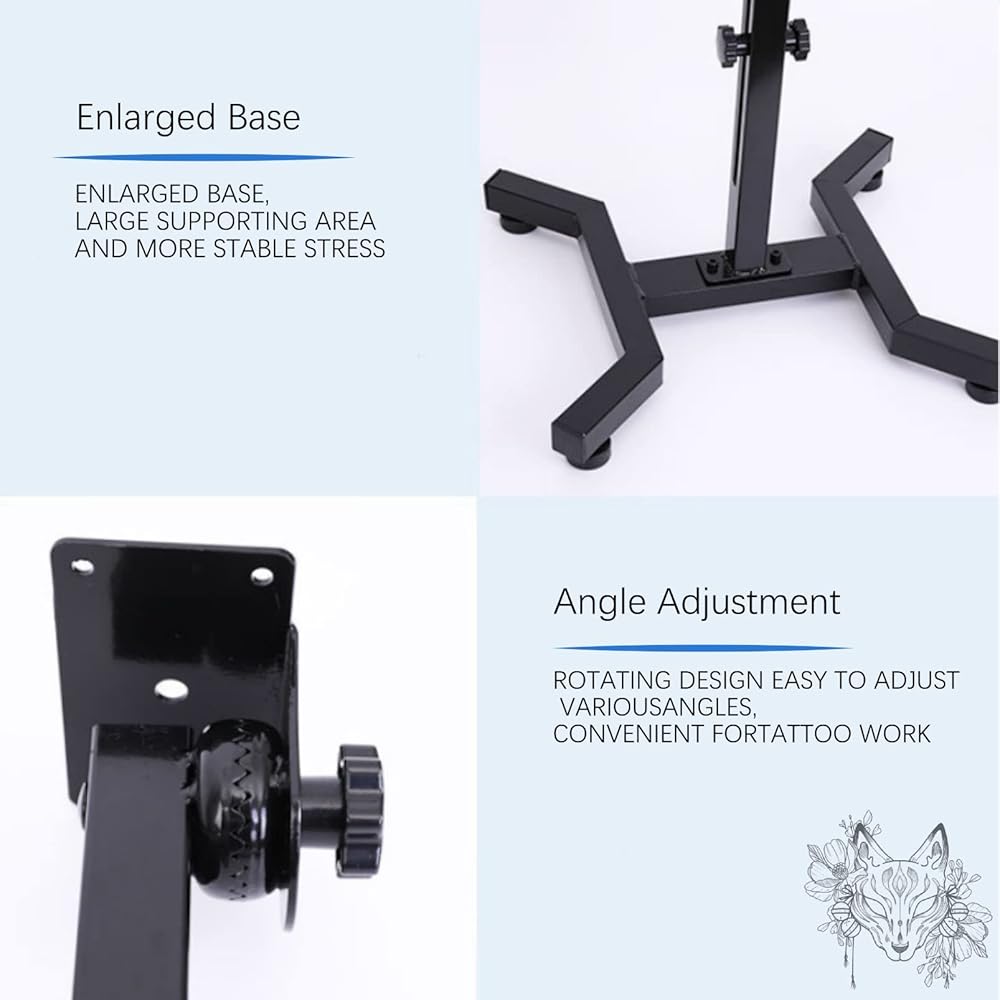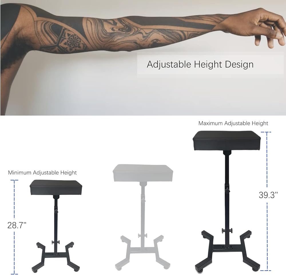 ارتفاع قابل للتعديل وتصميم زاوية: يمكن تعديل حامل الراحة هذا بارتفاع مختلف وفقًا للاحتياجات المختلفة. الارتفاع القابل للتعديل من 28.7 بوصة إلى 39.3 بوصة. حامل الوشم مع تروس عجلة قابلة للتعديل، وسادة الذراع يمكن إمالة 180 درجة، سيكون لديك العشرات من الخيارات للحصول على الراحة