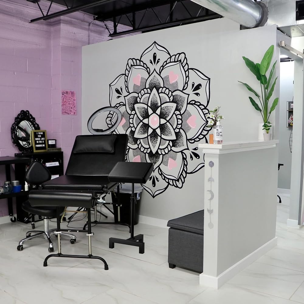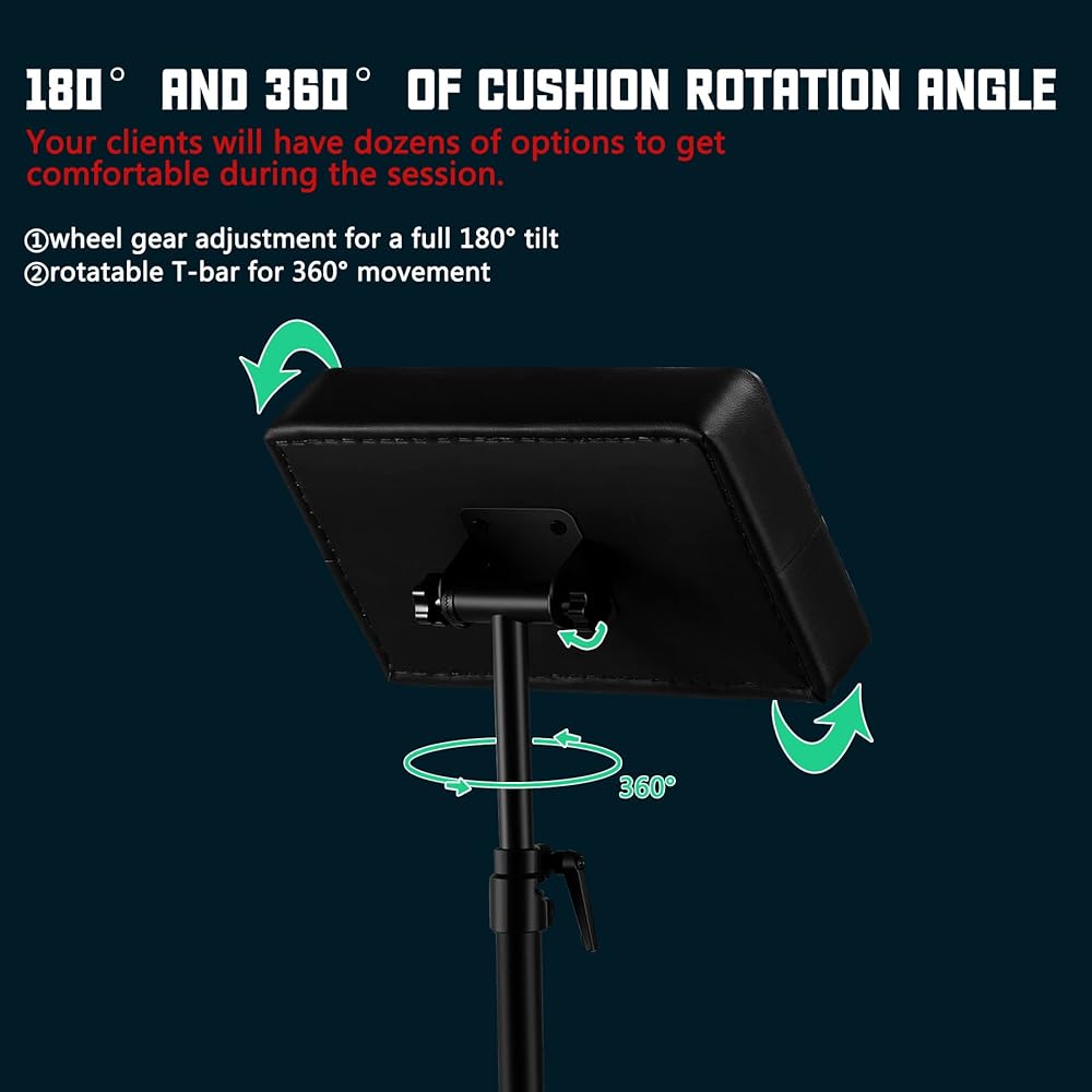 • 【زاوية دوران الوسادة 180 درجة و360 درجة】حامل الوشم مع تعديل تروس العجلة لإمالة كاملة 180 درجة وقضيب على شكل حرف T قابل للدوران لحركة 360 درجة، سيكون لدى عملائك العشرات من الخيارات للحصول على الراحة أثناء الجلسة.