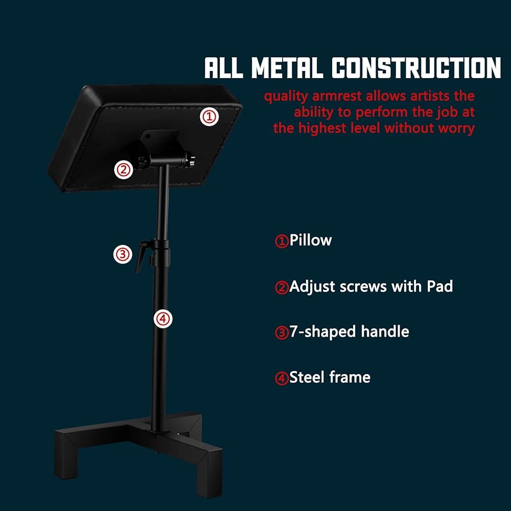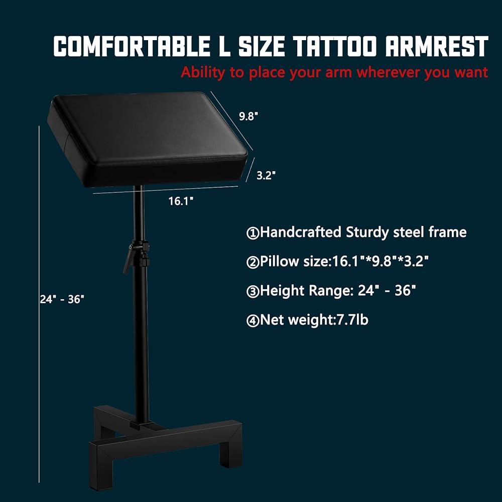 • 【حجم مسند ذراع الوشم】سيكون لدى عملائك العشرات من الخيارات للحصول على الراحة أثناء الجلسة. ارتفاع قابل للتعديل من 24 - 36 بوصة، مقاس الوسادة: 16.1*9.8*3.2 بوصة، السمك 3.2 بوصة؛ طول القاعدة 15.4 بوصة، العرض 11.8 بوصة.