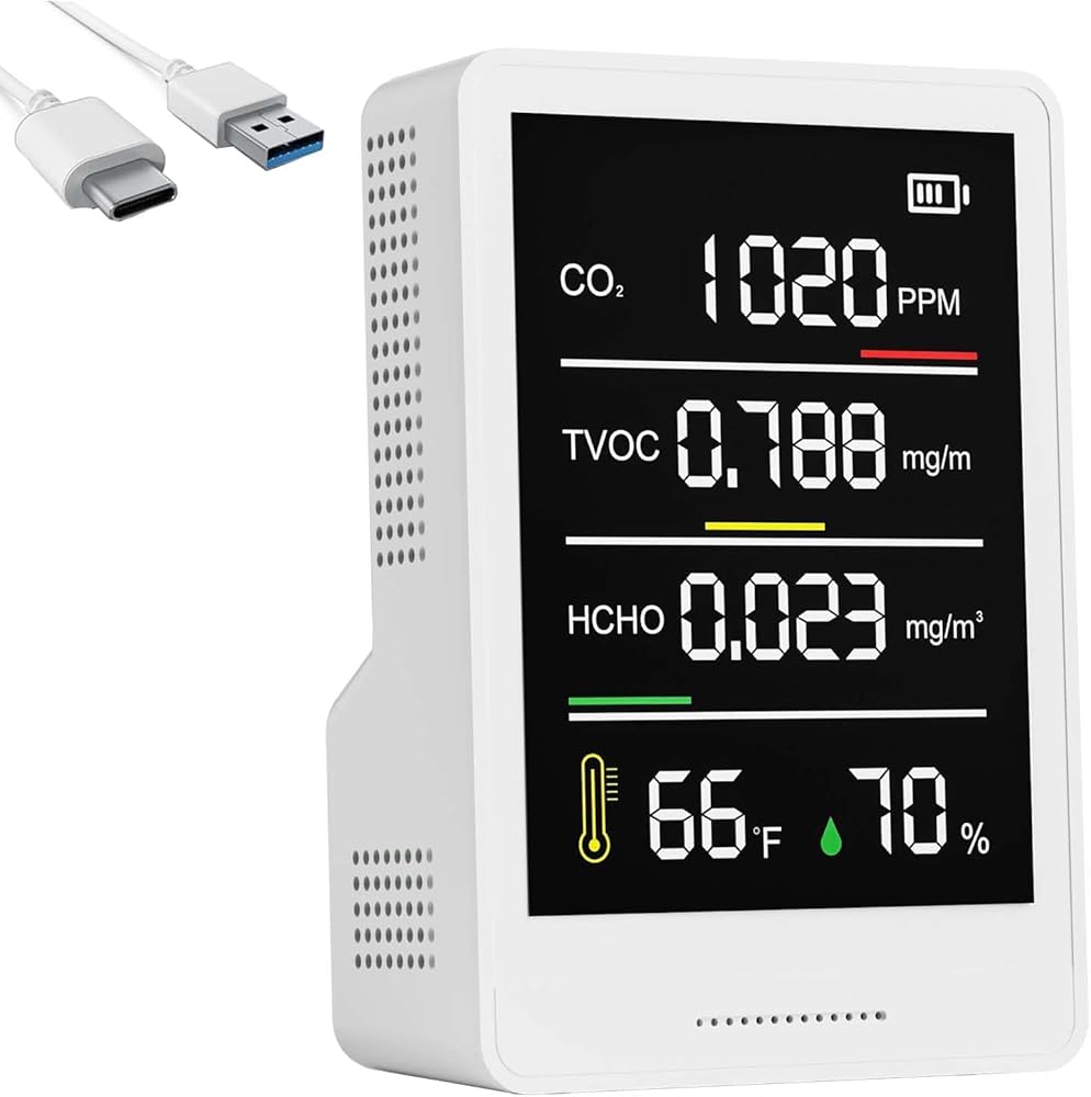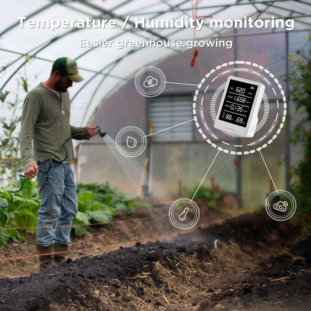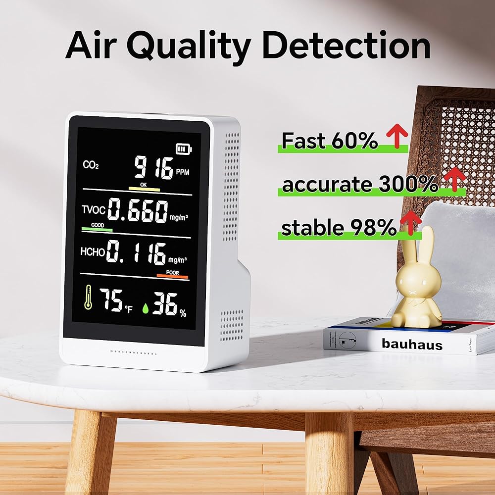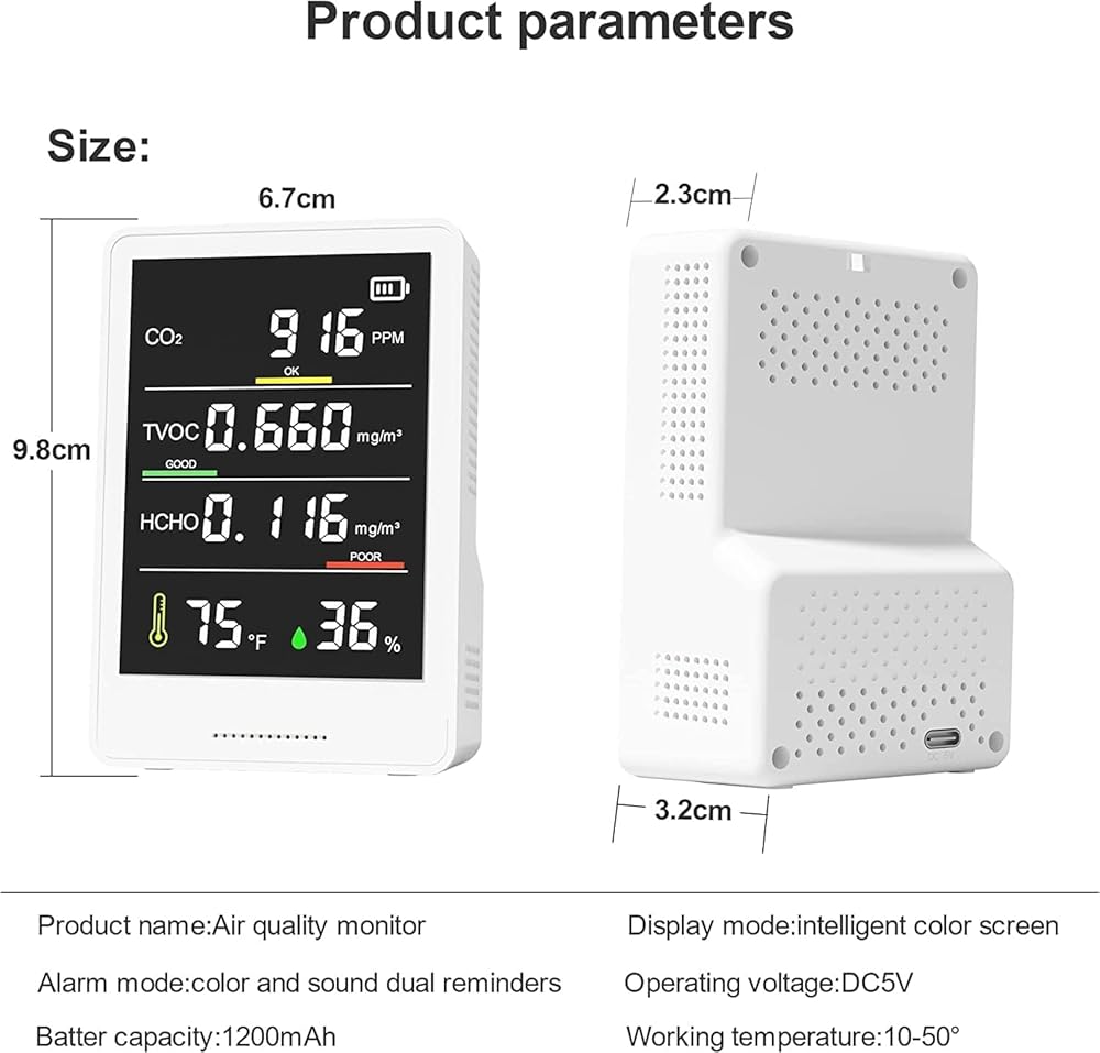 • 【احم كل أنفاسك】 نظرًا لأن الهواء النظيف يعني الكثير لكل شخص، فإن جهاز مراقبة جودة الهواء 5 في 1 سيكون خيارك الأفضل. يمكنه مراقبة ثاني أكسيد الكربون وTVOC وHCHO والرطوبة ودرجة الحرارة بدقة. يمكنك مراقبة البيئة في أي وقت.