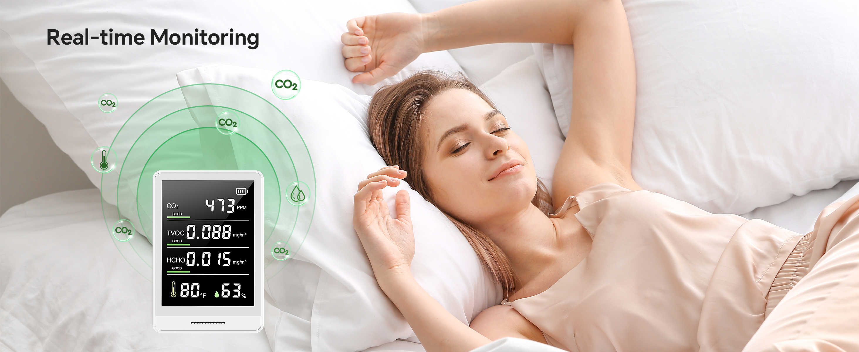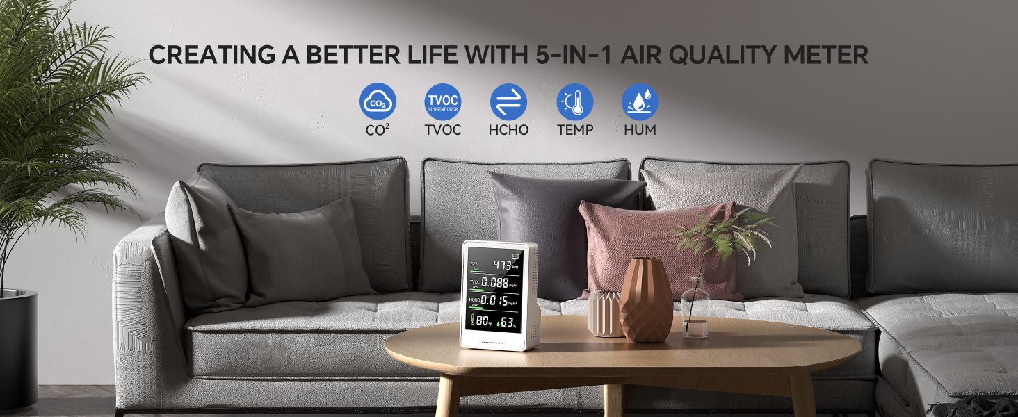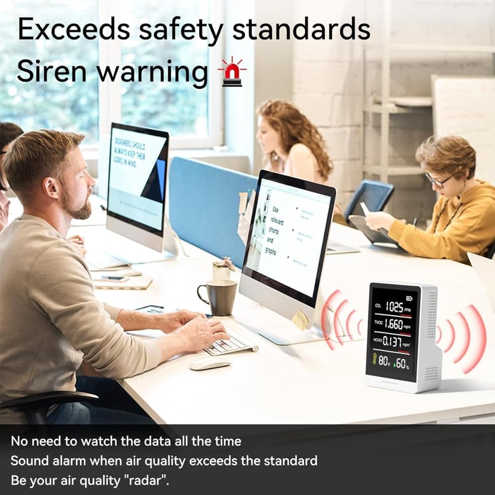 • 【احم كل أنفاسك】 نظرًا لأن الهواء النظيف يعني الكثير لكل شخص، فإن جهاز مراقبة جودة الهواء 5 في 1 سيكون خيارك الأفضل. يمكنه مراقبة ثاني أكسيد الكربون وTVOC وHCHO والرطوبة ودرجة الحرارة بدقة. يمكنك مراقبة البيئة في أي وقت.