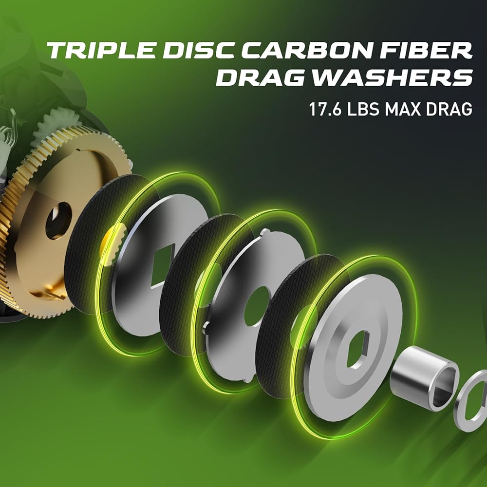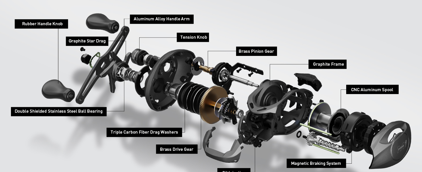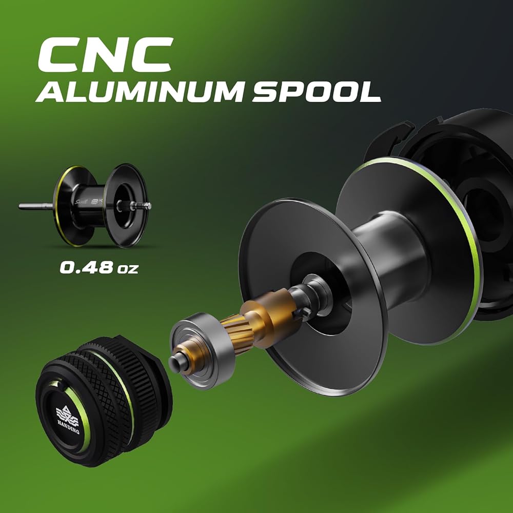 قوية - تتميز بكرات صب الطعم M1 بعمود رئيسي من النحاس الصلب للغاية، وتروس نحاسية مصنوعة بدقة وبكرات ألومنيوم مصنوعة بآلة CNC للحصول على قوة ومتانة استثنائية على الماء.
