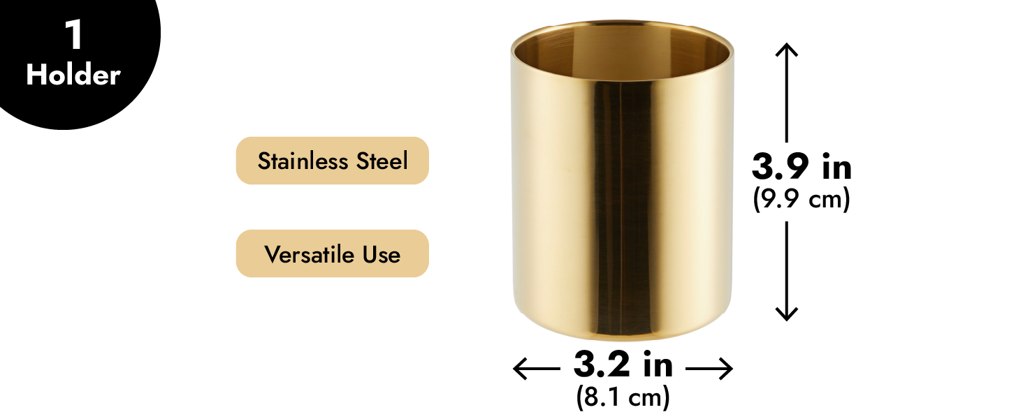 استخدامات متعددة: بالإضافة إلى اللوازم المكتبية، يعمل حامل الأدوات الذهبي هذا بمثابة فرشاة أسنان مثالية ومنظم للمكياج، مما يضيف لمسة من الأناقة إلى أي إعداد.