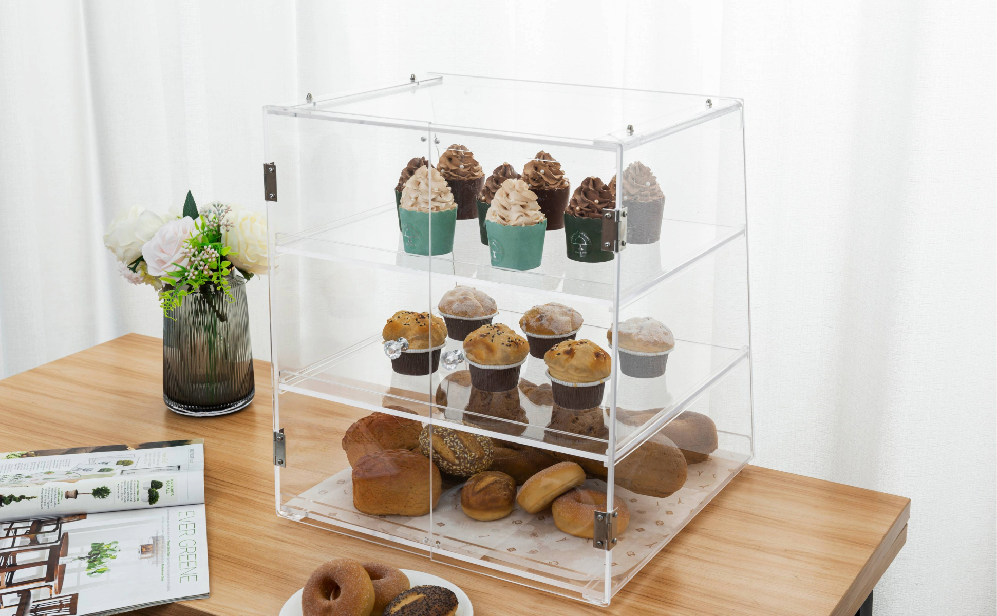 صندوق الخبز ذو 3 طبقات مصنوع من الأكريليك الشفاف بسمك 5 مم مع أجزاء معدنية متينة لضمان الاستخدام طويل الأمد.