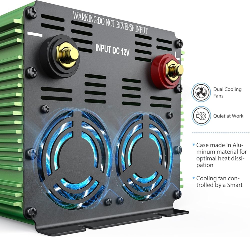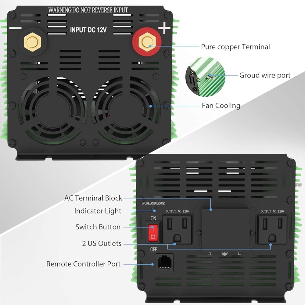 هذا عاكس موجة جيبية معدل 12 فولت 3000 واط والذي يحول تيار مستمر 12 فولت إلى تيار متردد 110 فولت/120 فولت. إنه مناسب بشكل مثالي للرحلات والتخييم والخيام ورحلات القوارب والعمل على الطريق وفي كل مكان حيث لا توجد كهرباء! ما عليك سوى توصيل عاكس الطاقة بالبطارية ثم توصيله بالأجهزة الكهربائية.