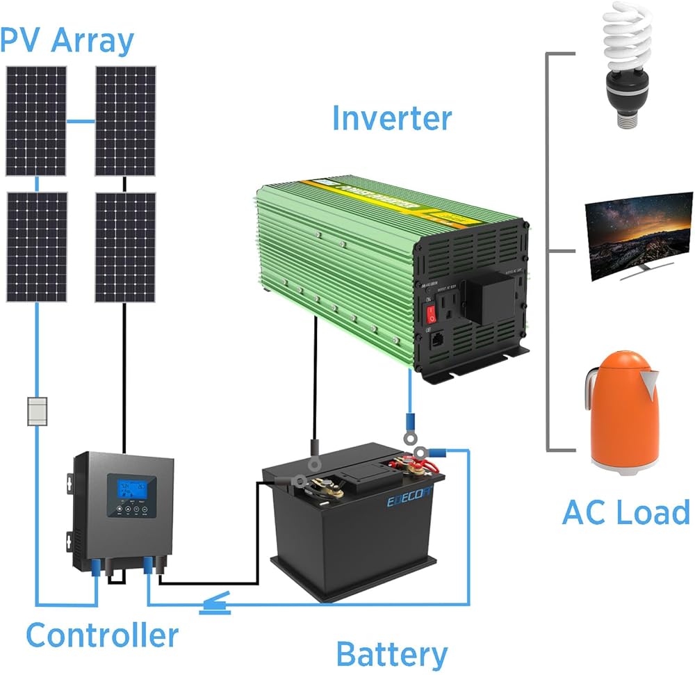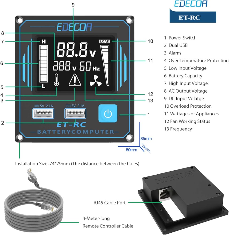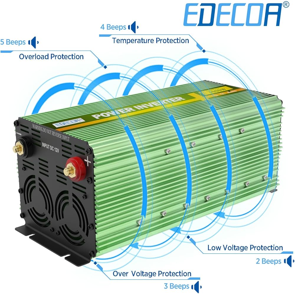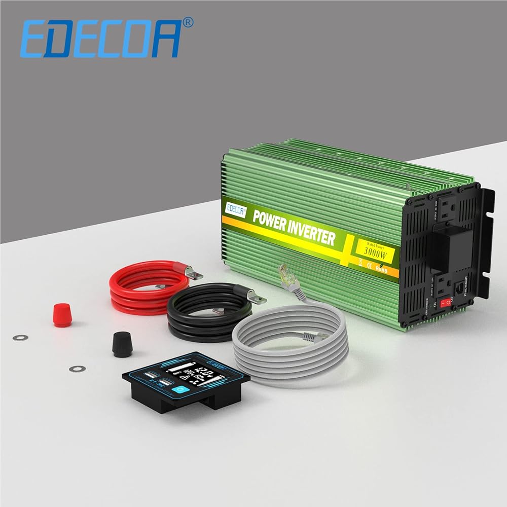 ما تحصل عليه: محول طاقة EDECOA 3000 واط، وكابلات البطارية، وجهاز التحكم عن بعد ودليل المستخدم.