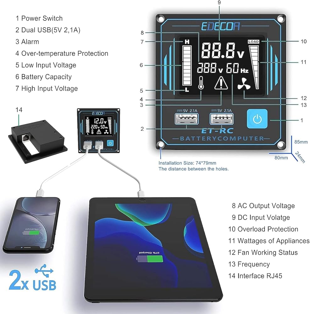 المعدات: 2 منافذ تيار متردد (مقابس أمريكية) ووحدة تحكم عن بعد مطورة مع شاشة LCD ذات تصميم متوافق مع البشر والتي يمكنك من خلالها التحقق من سعة البطارية ومستوى التحميل ودرجة الحرارة وحالة المروحة والتردد وجهد إدخال التيار المستمر وجهد إخراج التيار المتردد ومؤشر الحماية وما إلى ذلك.