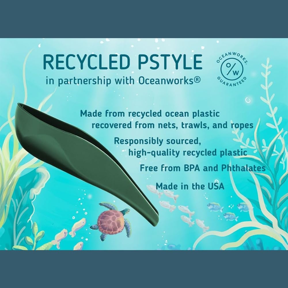 المادة: pStyle: تم تصنيع هذا pStyle بالشراكة مع Oceanworks من بلاستيك المحيط المعاد تدويره والمستعاد من شباك الصيد والشباك والحبال. تضمن شركة Oceanworks: الحصول على مصادر مسؤولة للمواد البلاستيكية المعاد تدويرها والأصلية وعالية الجودة والتي يمكن تتبعها للحفاظ على نظافة محيطاتنا. مادة البولي بروبيلين الخالية من البيسفينول والفثالات. الحقيبة: مصنوعة من قماش القطن العضوي المعتمد من GOTS. مشبك الشريط مصنوع من شريط Grosgrain القوي.