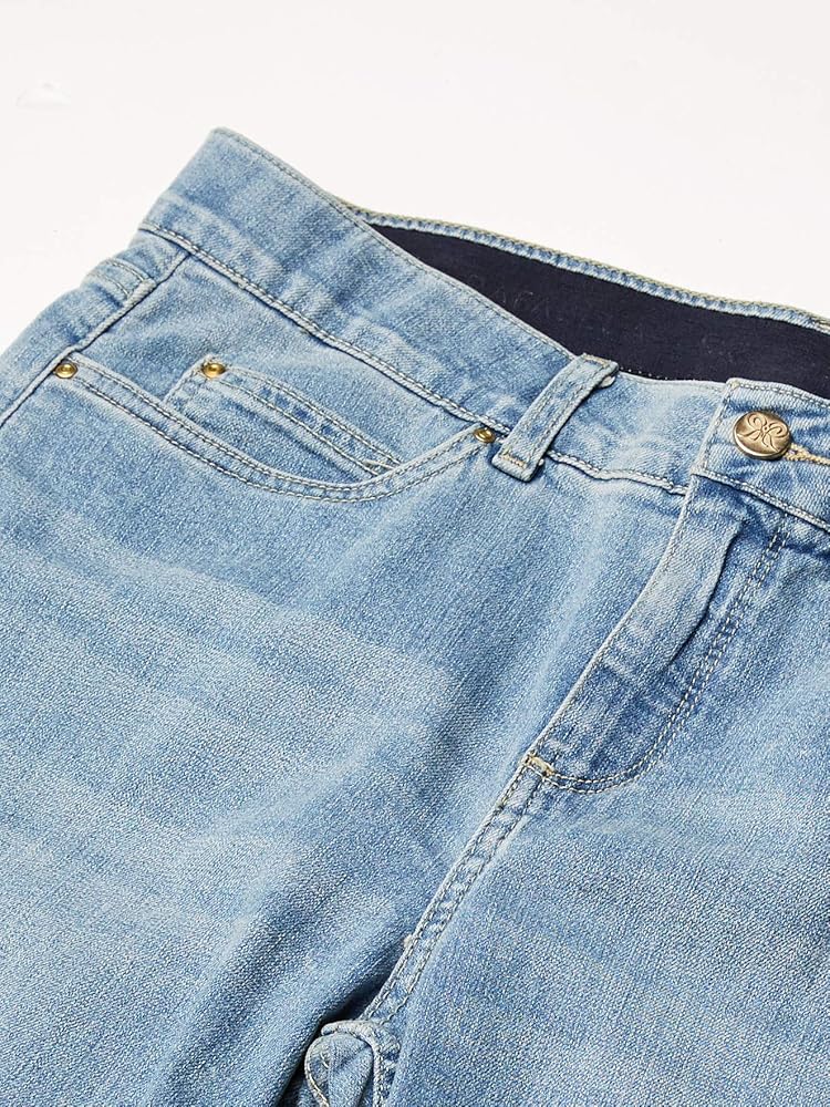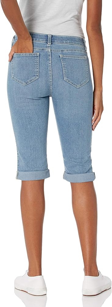Enjoy summer days in laidback style with these Rafaella light blue denim shorts. The slim fitting shorts follow your curves for a flattering look that finishes with a rolled cuff at the knee. Stretch in the material provides a comfortable fit for all-day weekend wear. Pair the shorts with a tee or casual blouse and soak up the sun with your girlfriends over drinks on the patio.