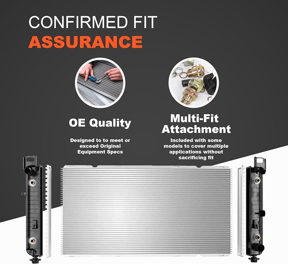 Klimoto radiators are designed and manufactured to meet or exceed OE manufacturer specifications for form, fit, and function and configured specifically to fit your vehicle. Select Klimoto radiators feature a thicker core, instead of the traditional standard size core for increased cooling capacity and greatly reduced chances of overheating. Folded tubes (B-Type) provide increased coolant heat transfer to the fins, for improved cooling capacity and better radiator performance. Engineered with thermal expansion cuts that reduce radiator fatigue failure by allowing greater core expansion and contraction in response to heating and cooling cycles. Klimoto radiators include 'Every-Fit' attachments to ensure that our radiators fit right, and install easily, the first time, every time - right out of the box, with no need to source additional fittings or components. Backed by a hassle-free 2-Year unlimited mile warranty. Please confirm fitment for your specific vehicle application by using the fit finder above.