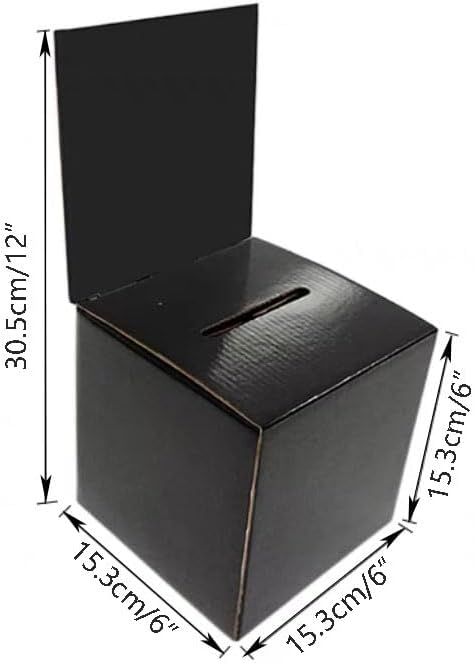 حجم صندوق تذكرة السحب هو 6 بوصات × 6 بوصات × 6 بوصات/15.3 سم × 15.3 سم × 15.3 سم، اللون أسود، المادة مكونة من 3 طبقات من الورق المموج السميك، قوي وصلب، الشكل مربع.
