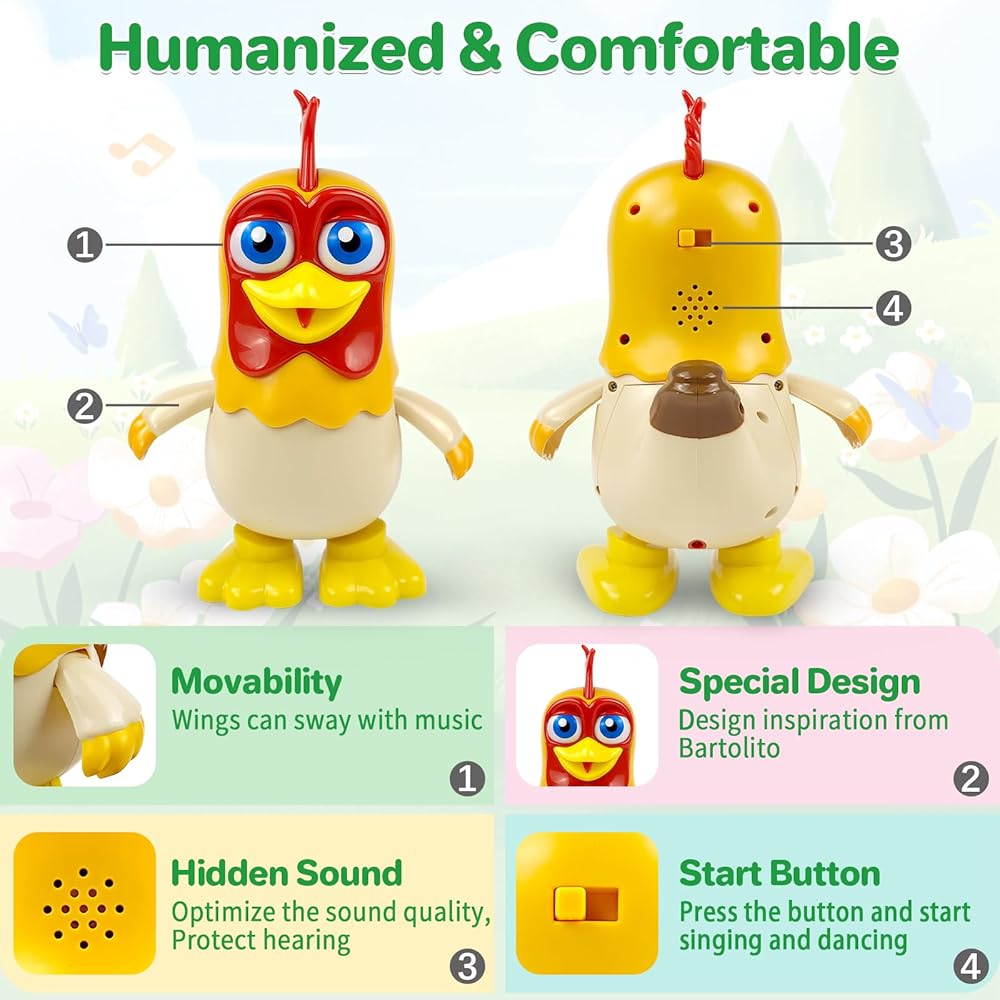• 🐣【السلامة وحماية البيئة】ألعاب رقص الأطفال لا جرانجا دي زينون تشيكن بارتوليتو غير سامة وعديمة الرائحة، ومصنوعة من بلاستيك أكريلونتريل بوتادين ستايرين المتين الذي يتوافق مع جميع معايير سلامة الألعاب الأمريكية. تعمل بالبطاريات (غير متضمنة). ألعاب صحية وآمنة للأطفال من عمر 1 2 3 4 سنوات.