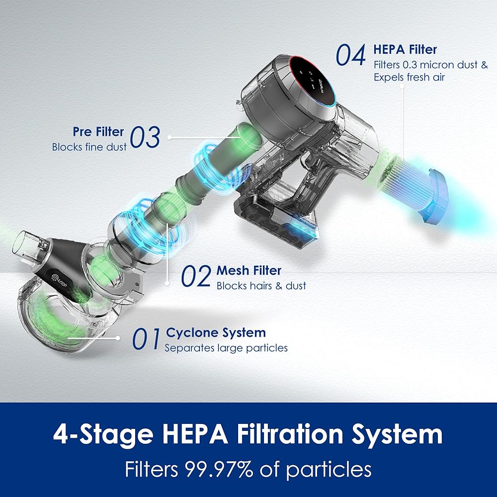 أداء تنظيف أفضل – يعمل نظام الترشيح والإعصار المغلق بالكامل والمكون من 4 مراحل على احتجاز 99.97% من الجزيئات الصغيرة التي يصل حجمها إلى 0.3 ميكرون، مما يوفر هواءً أنظف للبيئة. احصل على تنظيف عميق وشامل للسجاد مع قوة شفط قوية تصل إلى 130 واط في وقت أقل.