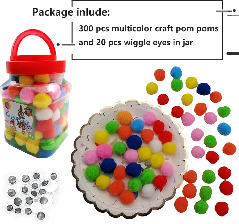 craft Pom poms set:Package inlude 300 pcs multicolor craft pom poms and 20 pcs wiggle eyes in jar,the dimension of pompoms is approx 1-Inch(2.5cm) in diameter.