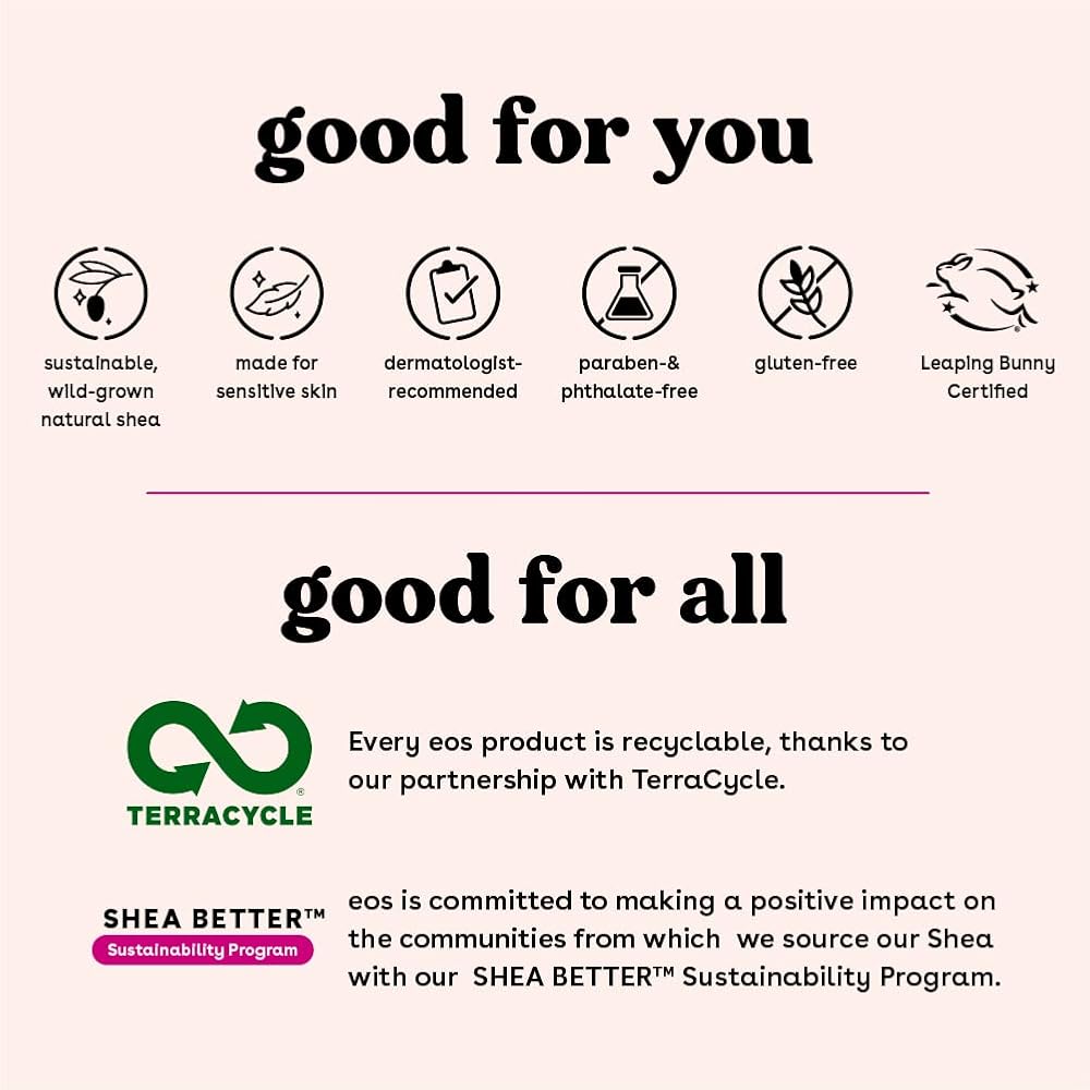 • مكونات من مصادر مستدامة: مرطب الشفاه eos يحتوي على زبدة الشيا الطبيعية والزيت من مصادر مستدامة ليترك شفتيك ناعمة ومغذية.