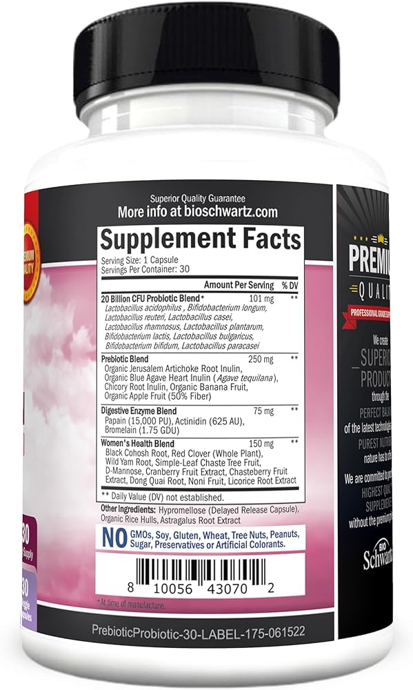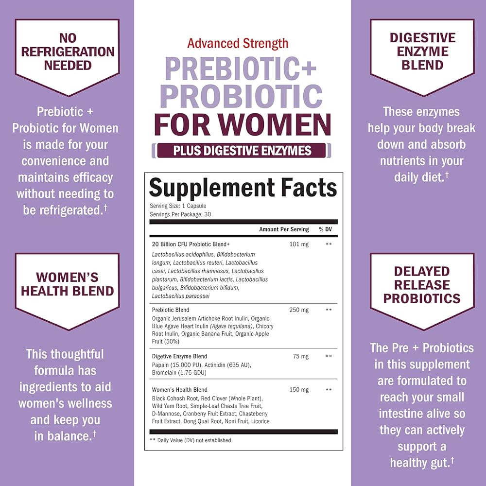 البريبايوتكس والبروبيوتيك للنساء - لدعم صحة الأمعاء والمهبل والمناعة مع الكوهوش الأسود والبرسيم الأحمر - كبسولات إنزيمات هضمية غذائية كاملة، مكمل بروبيوتيك لاكتوباكيللوس، 30 قطعة