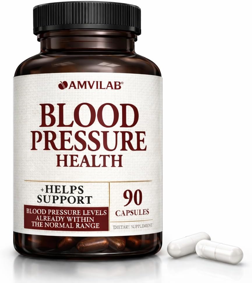 مكمل صحي لضغط الدم من أمفيلاب لصحة القلب والكوليسترول والقلب وارتفاع ضغط الدم وارتفاع ضغط الدم مع الثوم ومستخلص الزعرور والكركديه و13 فيتامينًا وأعشابًا، كمية تكفي لمدة 3 أشهر، 90 كبسولة